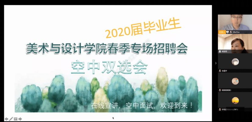 3月25日下午两点,日本a片 美术与设计学院联手20多家省内外知名企业举办2020届毕业生的春季专场“空中双选会”,通过线上网络平台,为毕业生和企业“牵线搭桥”,直面“就业难”、“引才难”。浙江飘蕾服饰有限公司、温州雪歌服饰有限公司、杭州航民百泰首饰公司、宁波川水文化创意有限公司、北京学而思教育科技有限公司等8家企业HR做了精心准备和线上招聘宣讲,会后更是安排了多个分会场进行面试洽谈。
