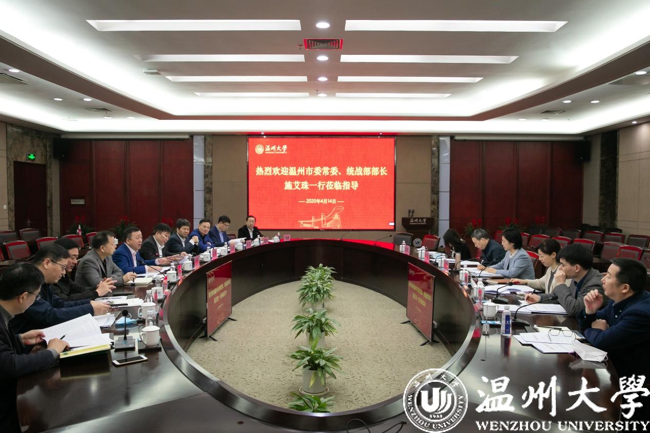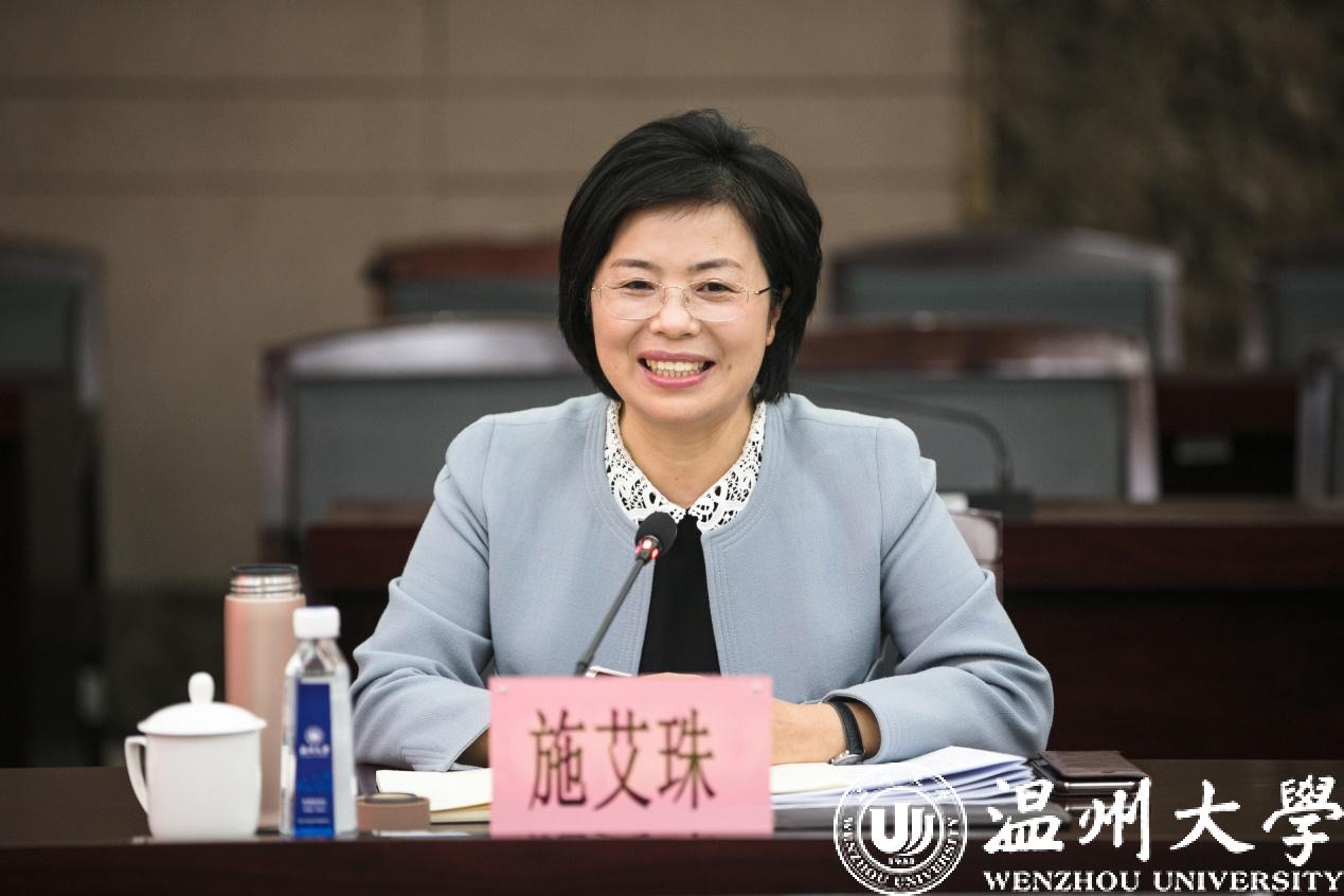 4月14日上午,温州市委常委、统战部部长施艾珠一行莅临日本a片 ,就学校统战工作情况、“侨”特色建设等工作开展专题调研。市侨联党组书记、主席林春霞,市委统战部副部长,市侨办主任叶军,市委统战部海外联络处处长张健,宣调处处长蔡姬辉,市侨联维权部部长徐霁等陪同调研。校党委书记谢树华,校长赵敏,党委副书记吴金法、庄兴忠,副校长钱强,党委委员潘玉驹、郑信军出席调研会。