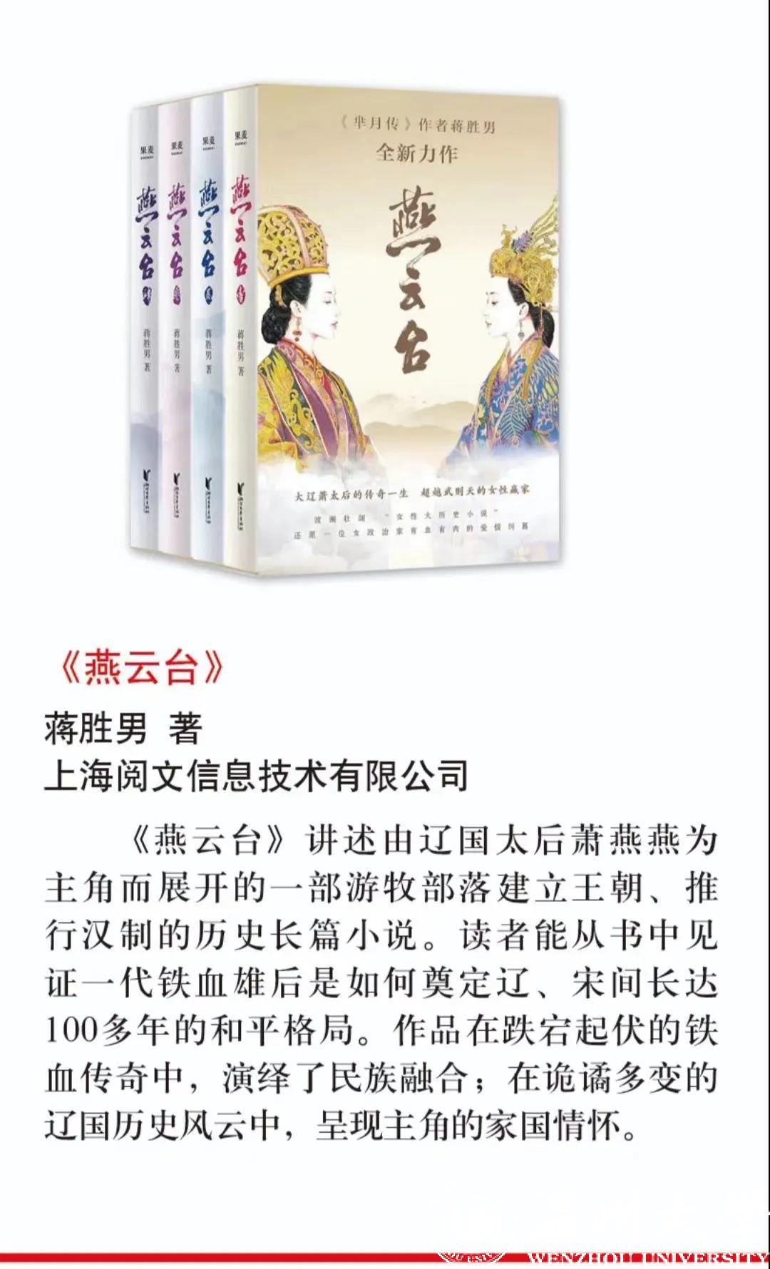 4月23日,在“2019年度中国好书”的评选中,由日本a片 蒋胜男研究员所著、浙江文艺出版社出版的《燕云台》荣膺网络文学类“2019年度中国好书”荣誉。