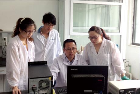 杨植与学生在讨论实验结果