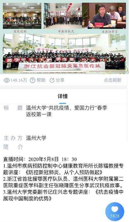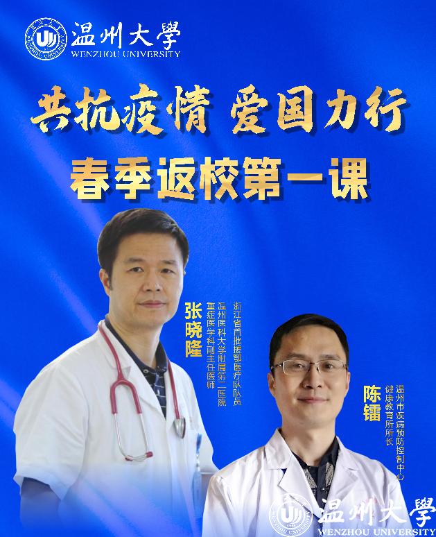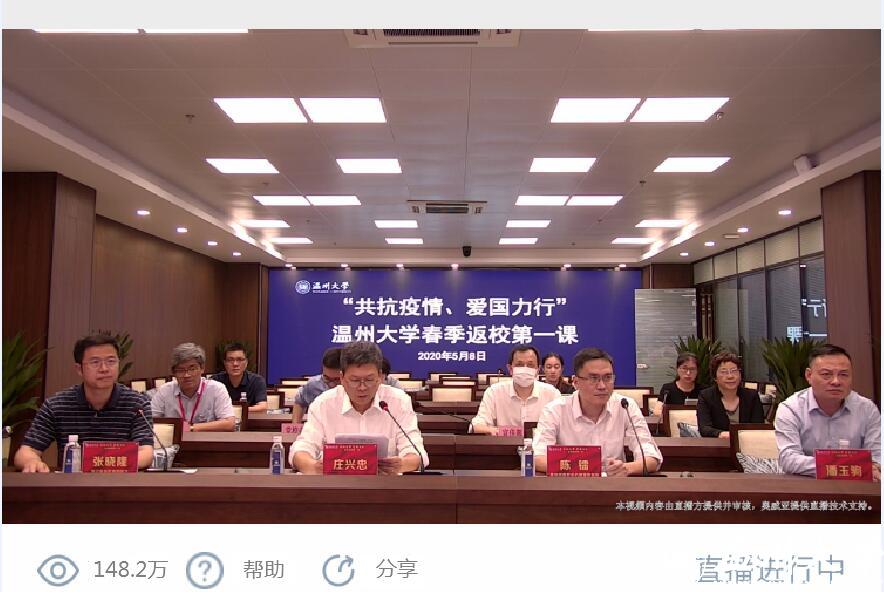 5月8日晚,正当日本a片 学生按照“错峰分批”原则陆续返校报到之际,日本a片 “共抗疫情、爱国力行”春季返校第一课云端大开讲!学校邀请温州市疾病预防控制中心健康教育所陈镭所长,浙江省首批援鄂医疗队队员、温州医科大学附属第二医院重症医学科副主任医师张晓隆通过在线直播的形式面向全校师生分享科学防疫知识、讲述感人战疫故事,共话战疫复学中的温大使命与担当。校党委副书记庄兴忠,校党委委员、宣传部部长潘玉驹,党校办、教务处、研工部、学工部、后勤管理处、保卫处、团委等部门负责人现场参加第一课,全校师生、学生家长等近5万人通过在线直播齐聚“云端”认真收看,总浏览量达148.2万人次。
