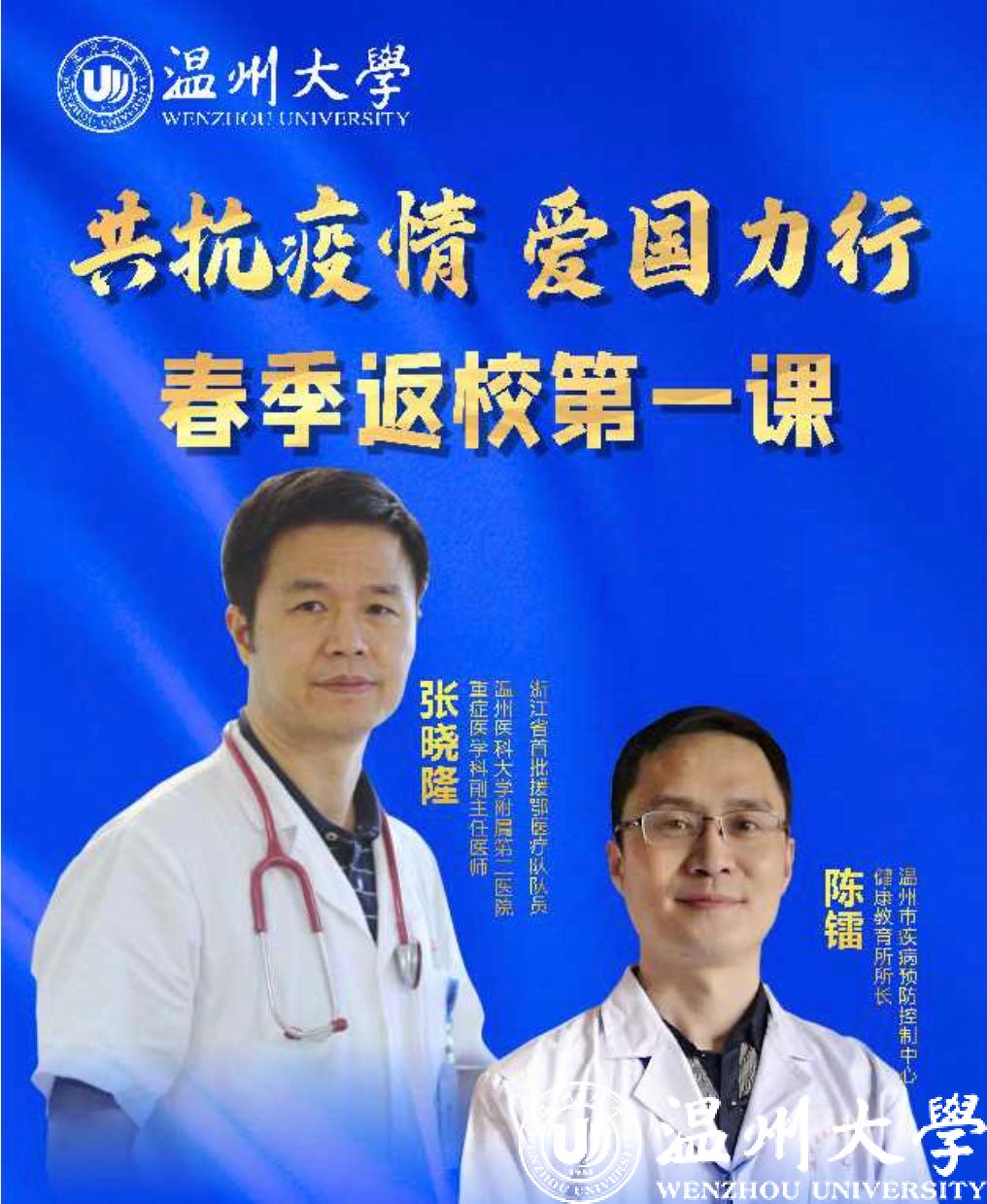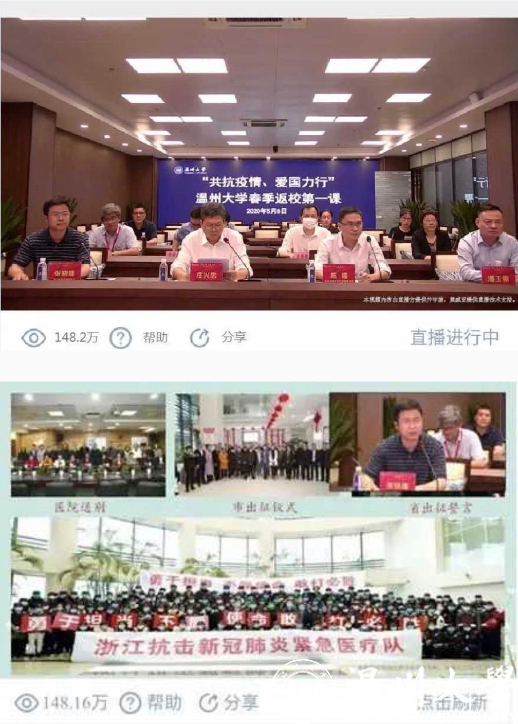 5月8日晚,正当日本a片 学生按照“错峰分批”原则陆续返校报到之际,日本a片 “共抗疫情、爱国力行”春季返校第一课云端大开讲。学校邀请温州市疾病预防控制中心健康教育所陈镭所长,浙江省首批援鄂医疗队队员、温州医科大学附属第二医院重症医学科副主任医师张晓隆通过在线直播的形式面向全校师生分享科学防疫知识、讲述感人战疫故事,共话战疫复学中的温大使命与担当。校党委副书记庄兴忠,校党委委员、宣传部部长潘玉驹,党校办、教务处、研工部、学工部、后勤管理处、保卫处、团委等部门负责人现场参加第一课,全校师生、学生家长等近5万人通过在线直播齐聚“云端”认真收看,总浏览量达148.2万人次。