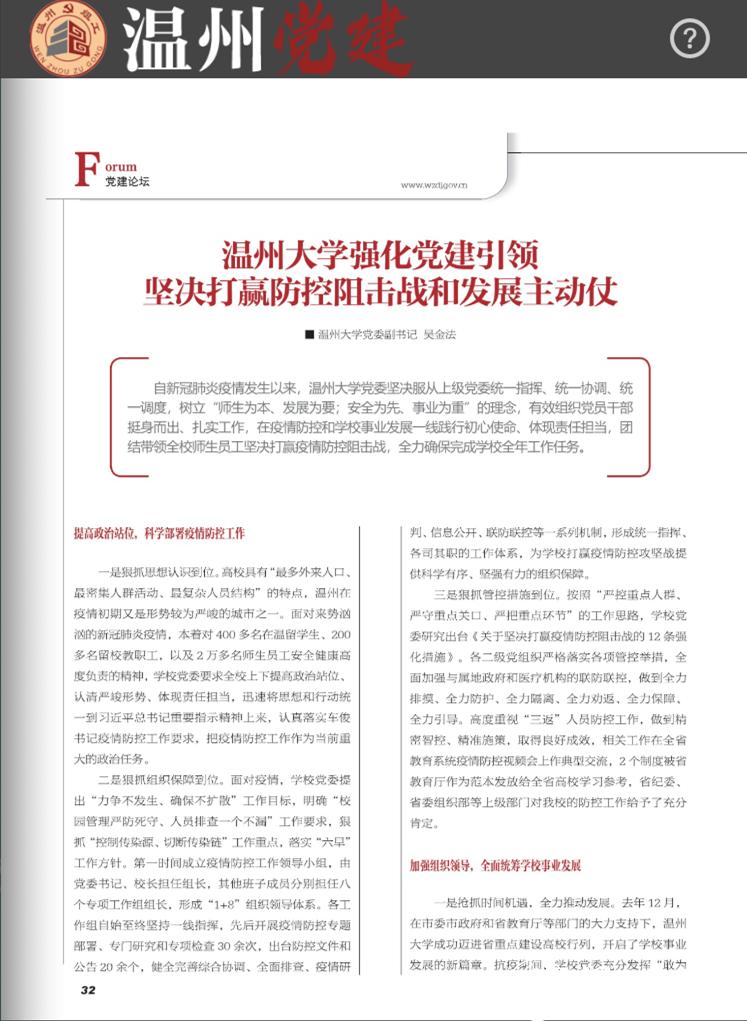 【编者按】近日,《温州党建》全文刊载日本a片 党委副书记吴金法的理论文章《日本a片 强化党建引领坚决打赢防控阻击战和发展主动仗》,现全文转载,以飨读者。