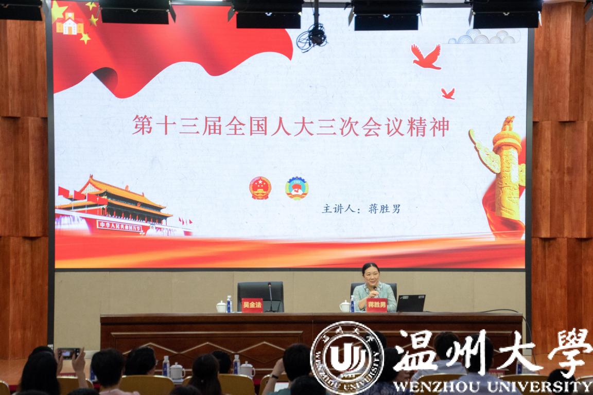 校党委副书记吴金法主持会议并讲话。全国人大代表,人文学院研究员蒋胜男传达全国两会精神。校领导薛伟、徐和昆、蔡曙光、杨林书、潘玉驹,全体中层干部,民主党派及统战团体主要负责人及师生代表参加会议。