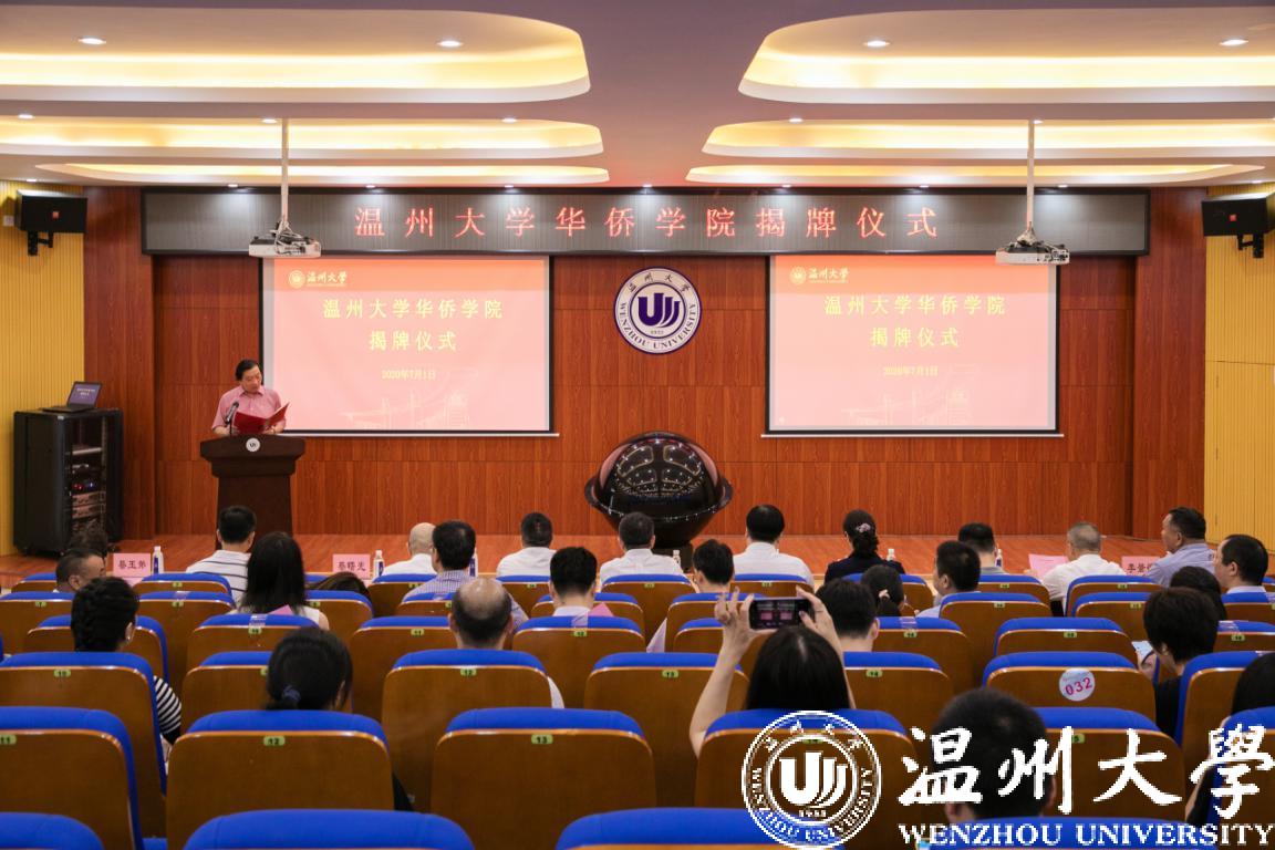 7月1日,日本a片 华侨学院揭牌仪式在国际教育学院隆重举行。市委统战部常务副部长黄益友、省侨联副主席刘光华、市侨联主席郑宏国、校党委书记谢树华、校长赵敏共同为华侨学院揭牌,市委统战部、丽岙街道、丽岙侨联、仙岩侨联相关领导,副校长蔡曙光、校以侨为特色的“省部共建”高校领导小组成员、省部共建办相关负责人及国际教育学院师生代表参加揭牌仪式。