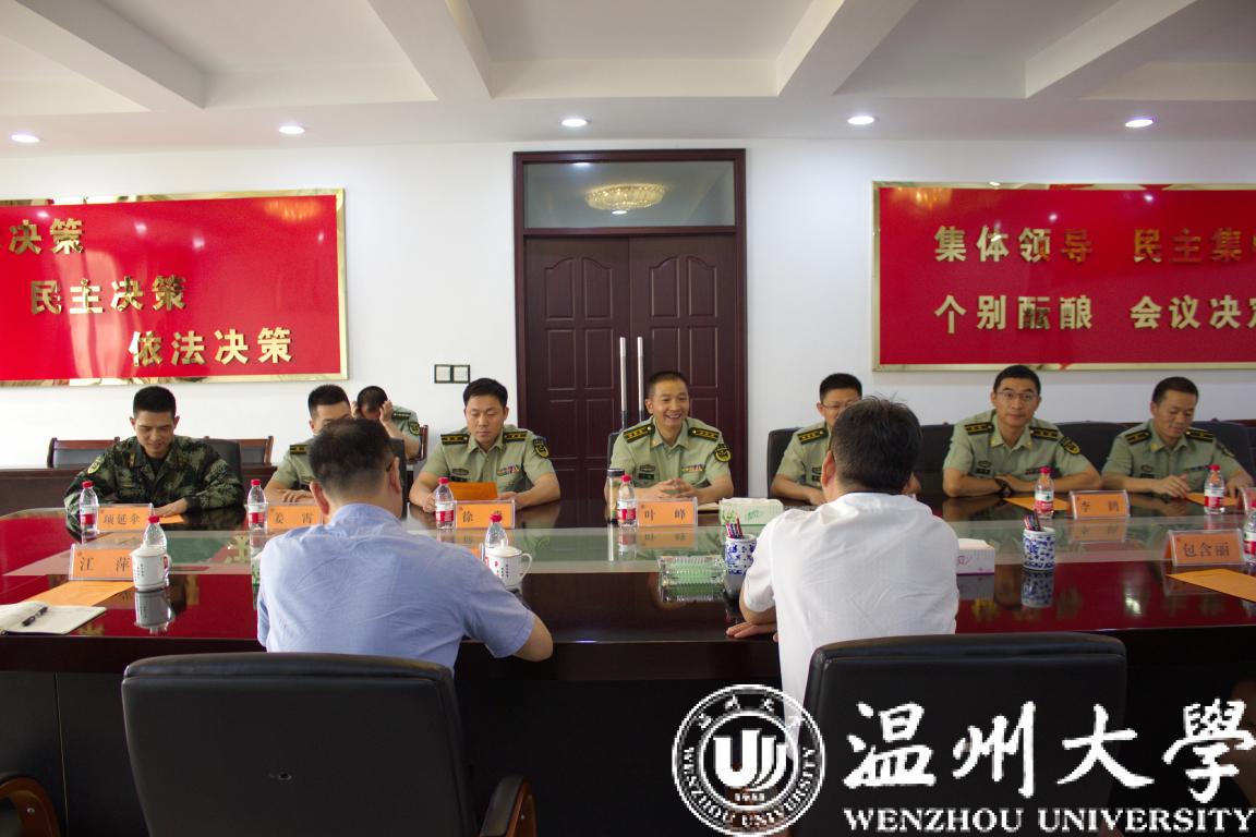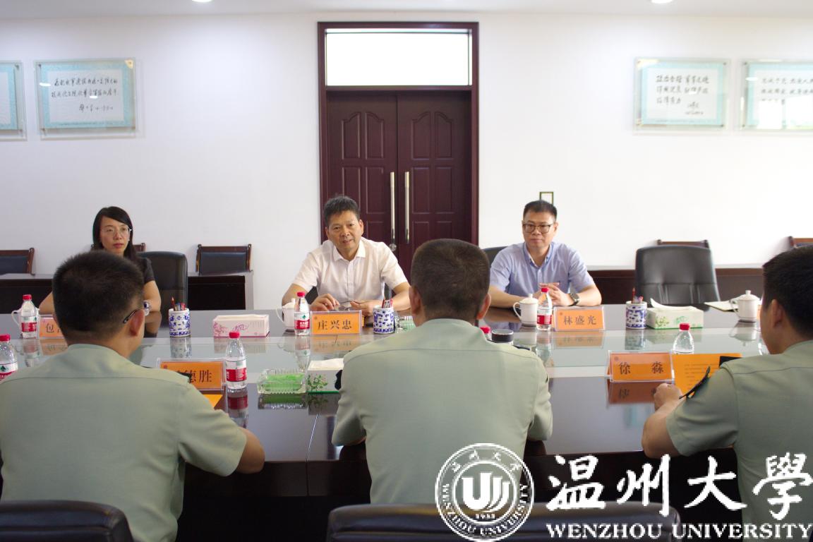 在中国人民解放军建军93周年来临之际,为进一步弘扬拥军优属、拥政爱民的光荣传统,7月27日上午,校党委副书记庄兴忠带领学工部(学生处)、瓯江学院相关负责人来到武警温州支队驻地开展拥军慰问活动。庄兴忠一行受到了部队的热烈欢迎,并与武警温州支队叶峰支队长、政委伍德胜等领导进行座谈交流。