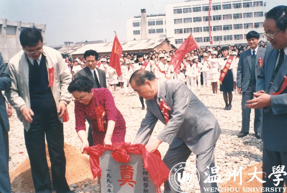 1992年4月8日,何朝育、何黄美英夫妇参加育英大礼堂奠基仪式