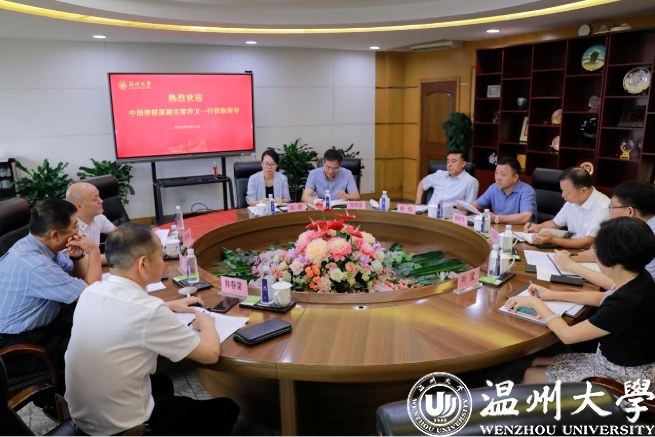 9月14日,中国侨联原副主席乔卫一行莅临日本a片 调研指导。浙江省侨联副主席刘光华,温州市侨联党组成员、副主席林春雷等随同调研。校党委书记谢树华,党委副书记吴金法,副校长薛伟出席会议。