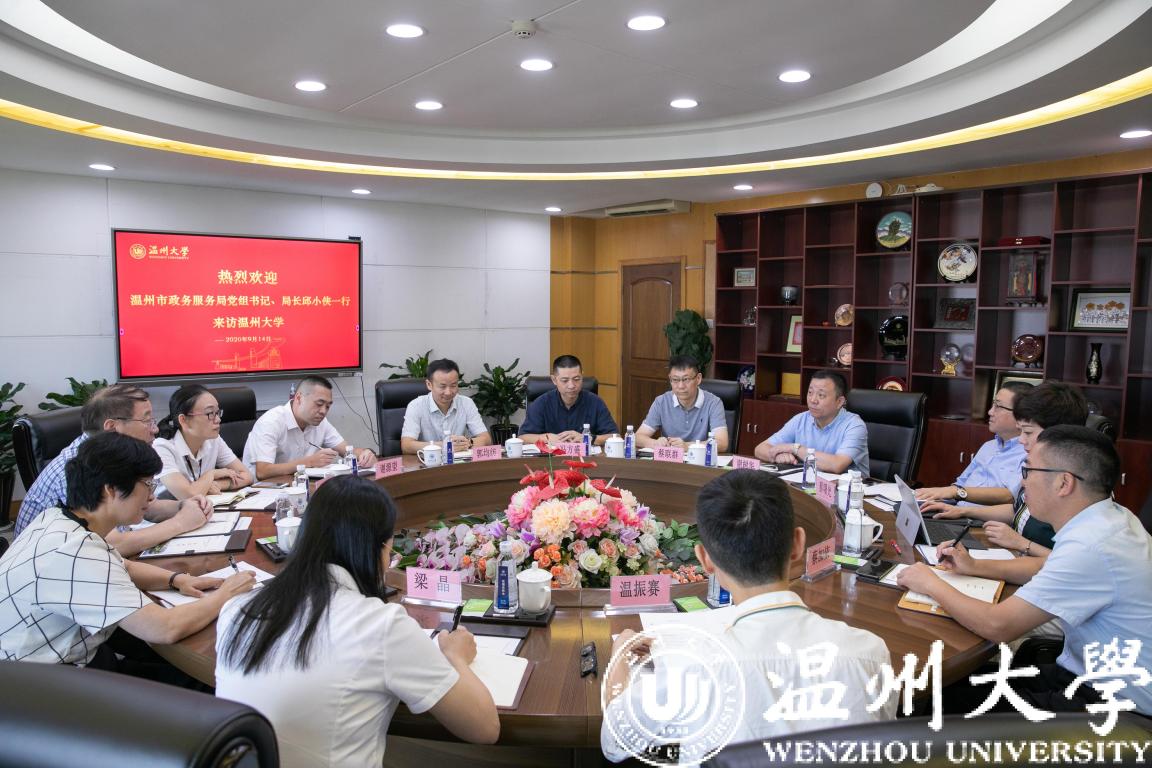 9月17日,温州市政务服务局党组书记、局长邱小侠,副局长詹尔成等一行来访日本a片 。校党委书记谢树华,副校长蔡曙光出席接待,相关部门负责人参加座谈。