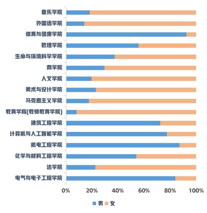 在各学院男女比例上,男生最多的学院是体育与健康学院,男生占比92.52%,女生占比7.48%。男生占比明显较大还有机电工程学院、电气与电子工程学院等;女生最多的学院是教育学院,女生占比91.89%,男生占比8.11%。女生占比明显较大的还有音乐学院、外国语学院、人文学院等。这几个学院的男女同学可以“互补”联谊哦!