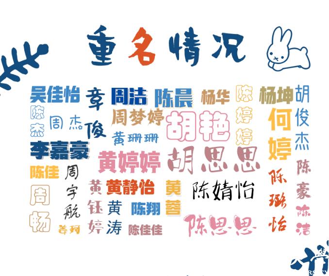 今年,80多对新生同名同姓,包括周杰、周洁、陈洁、胡俊杰、陈佳、陈佳佳、黄婷婷、陈婷婷、周梦婷、黄钰婷、章俊、黄珊珊、胡思思、陈思思、陈璐怡、陈婧怡、陈晨、陈翔、杨华、杨坤、胡艳、何婷、陈豪、黄蓉、黄静怡、黄涛、周宇航、姜珂、周畅等。另外,叫吴佳怡、李嘉豪、陈杰的各有3人。