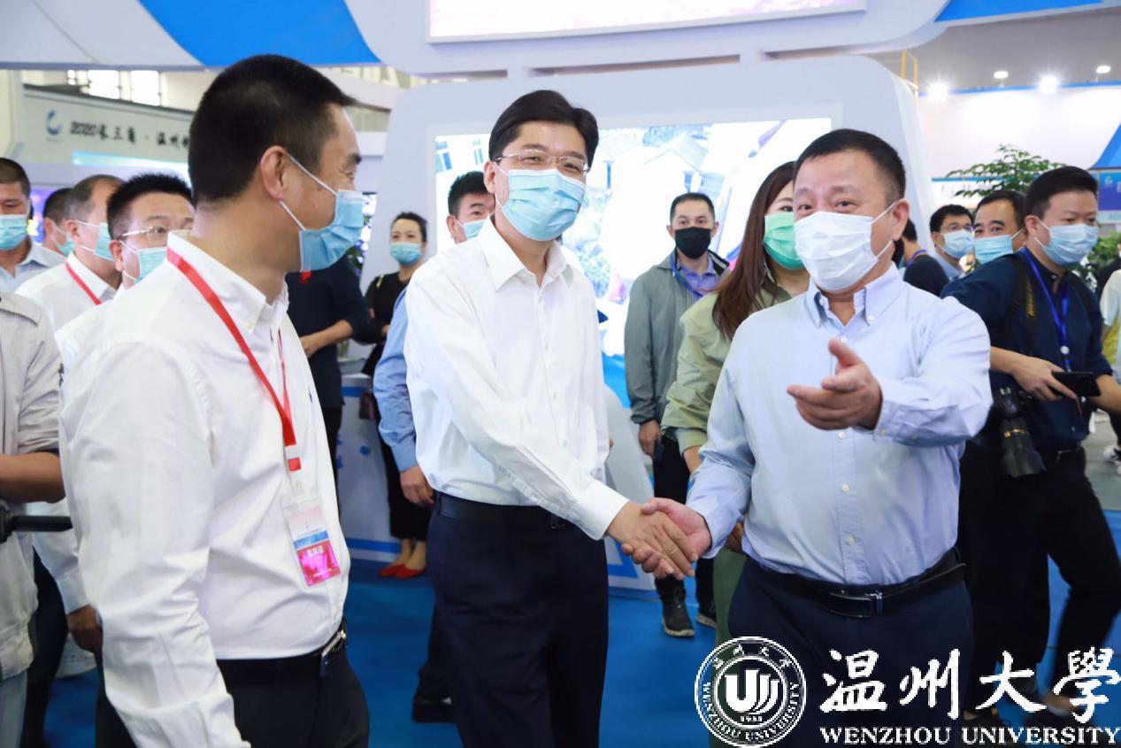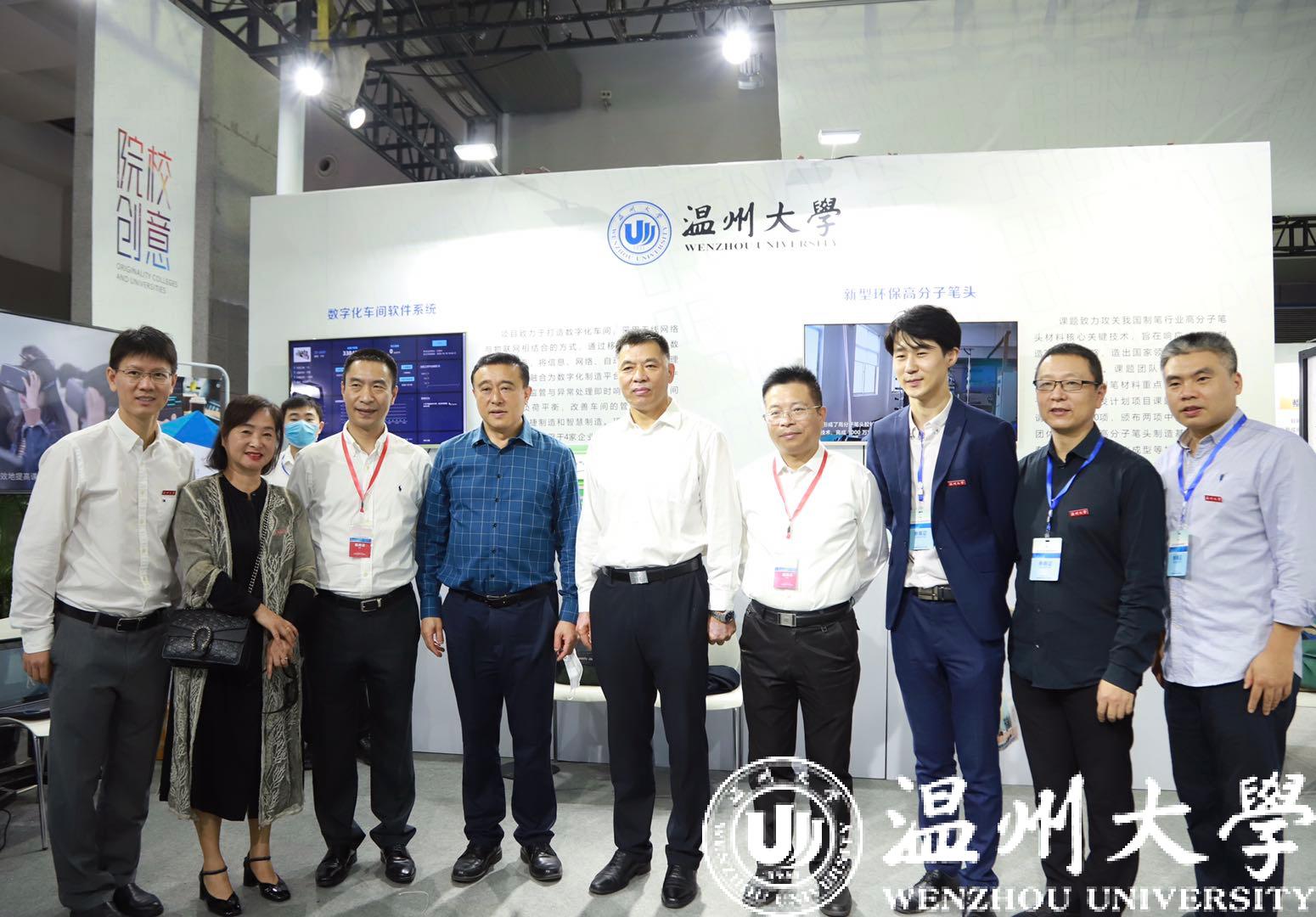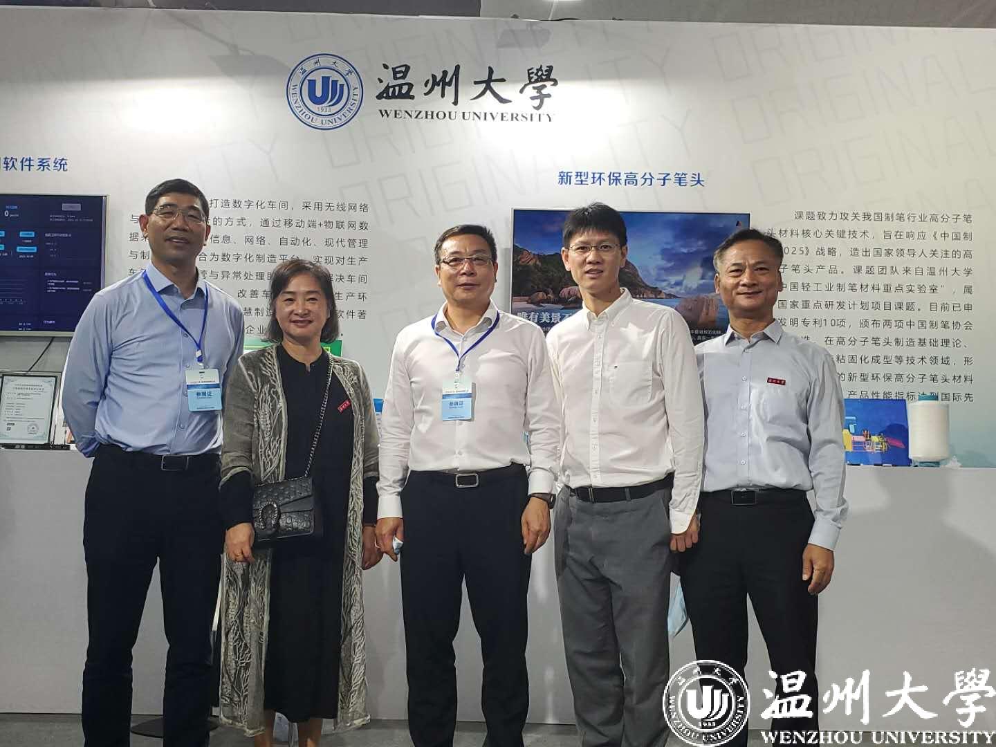 温州市委副书记、市长姚高员莅临温大展馆,在校党委书记谢树华的陪同下参观温大展馆项目。姚高员听取了新型环保高分子笔头项目介绍,询问了项目产业化情况、与温州本土企业合作情况以及目前技术水平领先程度,并对该项目助力温州制笔行业的发展给予了充分肯定。