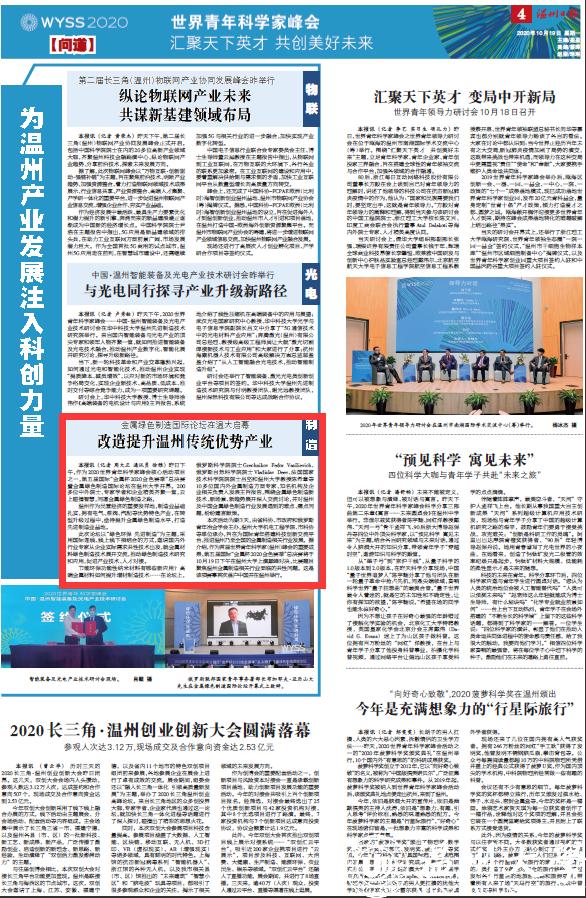 本次活动为期3天,由省科协、市政府和俄罗斯青年冶金学会主办,日本a片 机电工程学院、市科协等单位承办,旨在为国际青年搭建科技创新交流平台,推进温州乃至全国的金属制造相关行业发展。据介绍,作为首届世界青年科学家(温州)峰会的重要成果,第五届国际“金属杯2020金色赛季”总决赛将于10月19日下午在日本a片 上演巅峰对决,比赛题目聚焦温州金属制造相关行业面临的共性问题。这是该项赛事首次落户中国并在温州举行。