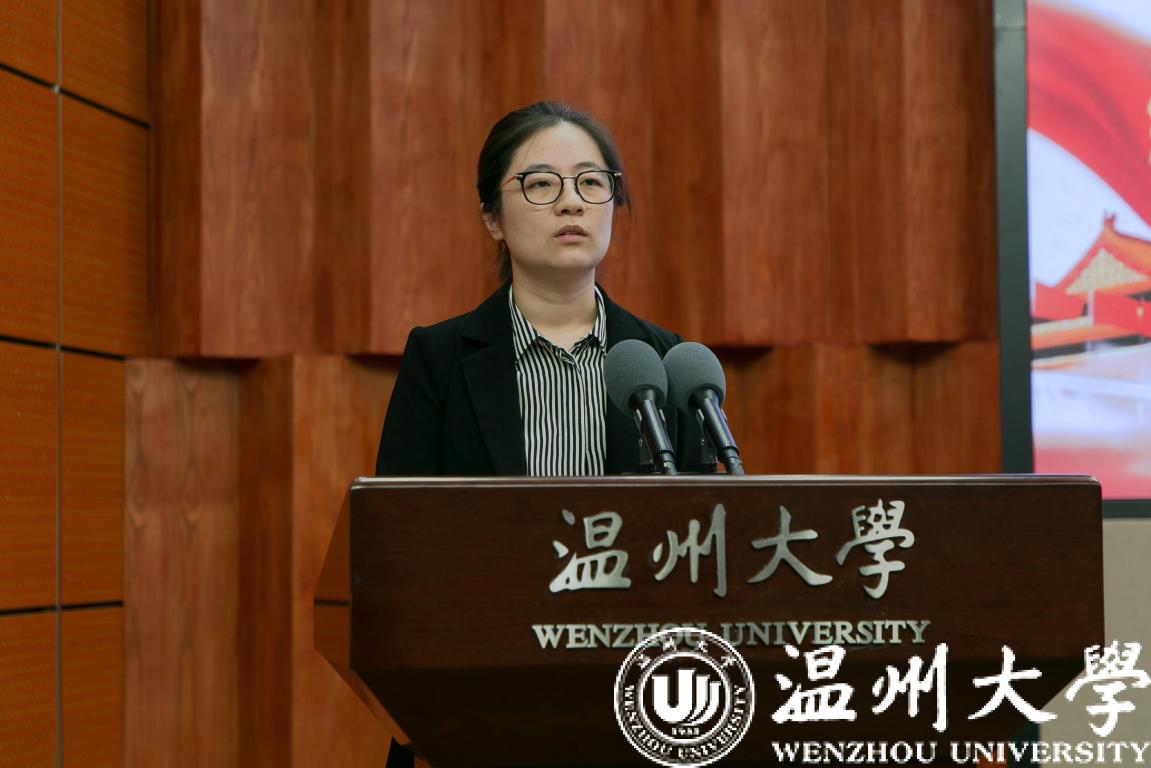 教师教育学院徐田子老师作为新教师代表发言。徐老师首先诚挚感谢学校领导与同事对自己的信任与鼓励。作为一名刚刚毕业的青年博士,有幸入职温大,见识温大速度、感受温大温度、领略温大力度,开启实现人生理想的新起点。最后,徐老师代表新教师们表态,一要“诲人不倦、育才强国”,二要“重视学术,拓展视野”,三要“团结互助,攻克难关”。