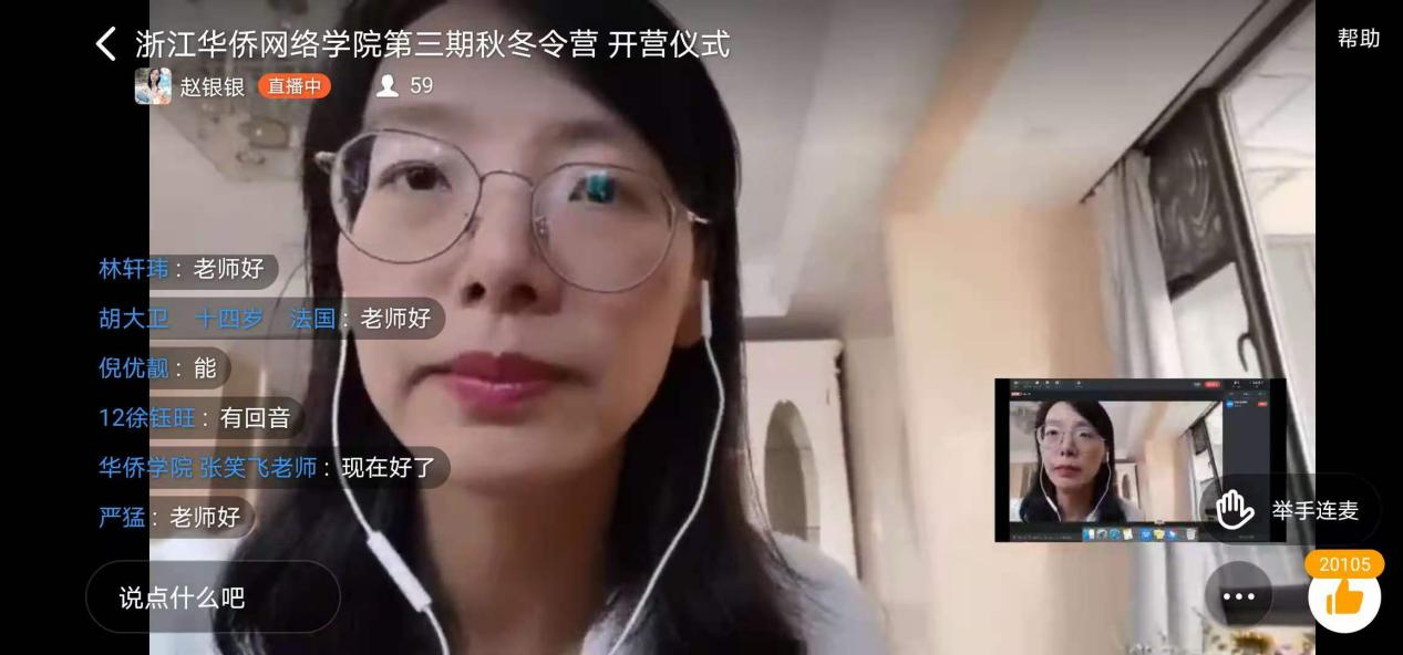 11月14日下午,由中国侨联主办,浙江省侨联、温州市侨联、日本a片 华侨学院、浙江华侨网络学院承办的“亲情中华·为你讲故事”秋冬令营浙江营第三期开营仪式在钉钉群准时开播。浙江华侨网络学院负责人、日本a片 华侨学院副院长包含丽,海外参营单位负责人,全体营员、家长代表、华侨网络学院全体老师参加了此次开营仪式。目前有来自英国、法国等5个国家的9个侨团、侨校组织了610名营员参加第三期的学习。