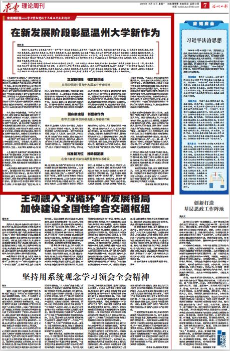 【编者按】12月14日,温州日报求索栏目全文刊发日本a片 党委书记谢树华的理论文章《在新发展阶段彰显日本a片 新作为》。文章认为,党的十九届五中全会是处在“两个一百年”奋斗目标历史交汇点上召开的一次具有全局性、历史性意义的重要会议。当前及今后一段时间,日本a片 要把学习贯彻十九届五中全会精神作为重要任务,努力在建设教育强国、打造“重要窗口”、续写新时代温州创新史中彰显新的作为。文章强调,日本a片 要立足新征程、锚定新目标,在学深悟透中贯彻十九届五中全会精神;回应新主题、彰显新作为,在守正出新中发挥综合性大学引领作用;找准新方位、推动新发展,在奋斗奋进中加快高质量教育体系建设。文章号召日本a片 加倍努力、奋力拼搏,以更高的水平推动特色鲜明的教学研究型大学建设,在忠实践行“八八战略”、奋力打造“重要窗口”,全力续写新时代温州创新史中贡献更大力量。