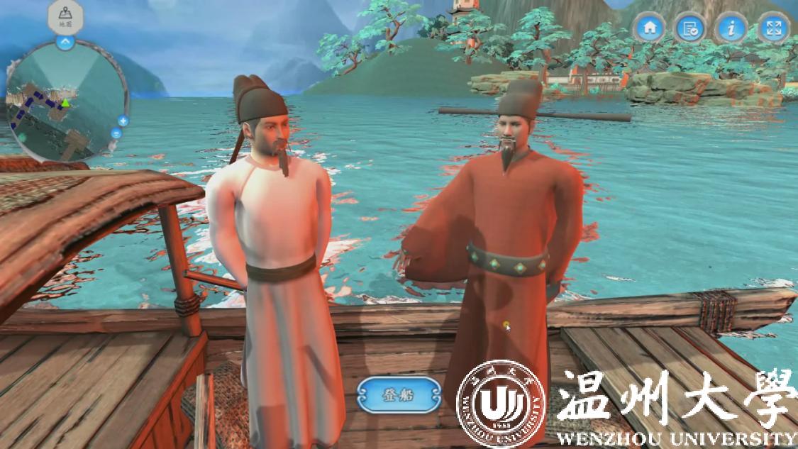温州作为山水诗发源地,研发团队将此作为教学项目主题,学生可选取山水诗鼻祖谢灵运、山水诗代表诗人孟浩然、文天祥等文人作为虚拟仿真实验中的特定角色,以江心屿作为特色地标。在技术渲染的手段下,学生可以在充满意境的虚拟仿真环境中沉浸式地学习古典诗词,真正达到在自主学习过程中掌握系统化知识的目的。