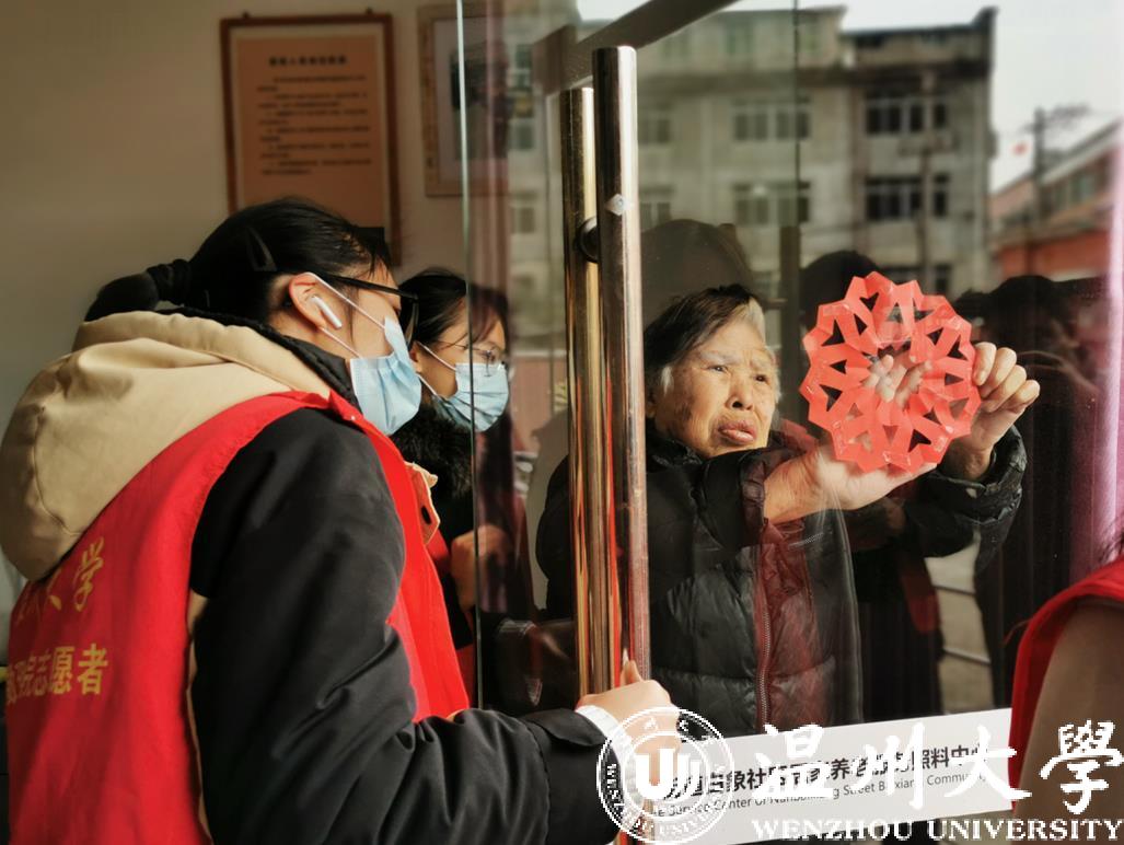 “阳光”志愿者和爷爷奶奶们一起贴窗花