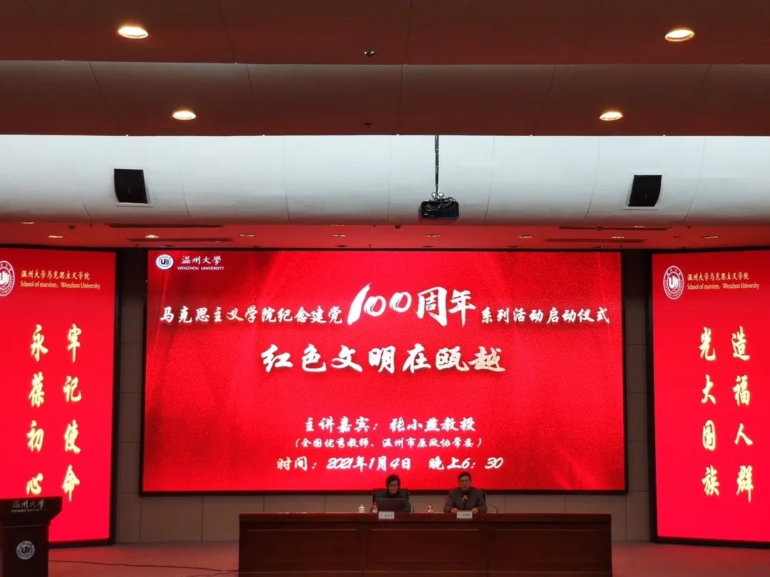 “胸怀千年伟业,恰是百年风华”,1月4日晚,马克思主义学院在育英图书馆二楼报告厅隆重举行庆祝建党100周年系列活动启动仪式,邀请全国优秀教师、原温州政协常委张小燕教授做开篇第一讲:红色文明在瓯越。学院党员教师、全体研究生、本科生参加活动,学院党委书记王柏民主持。