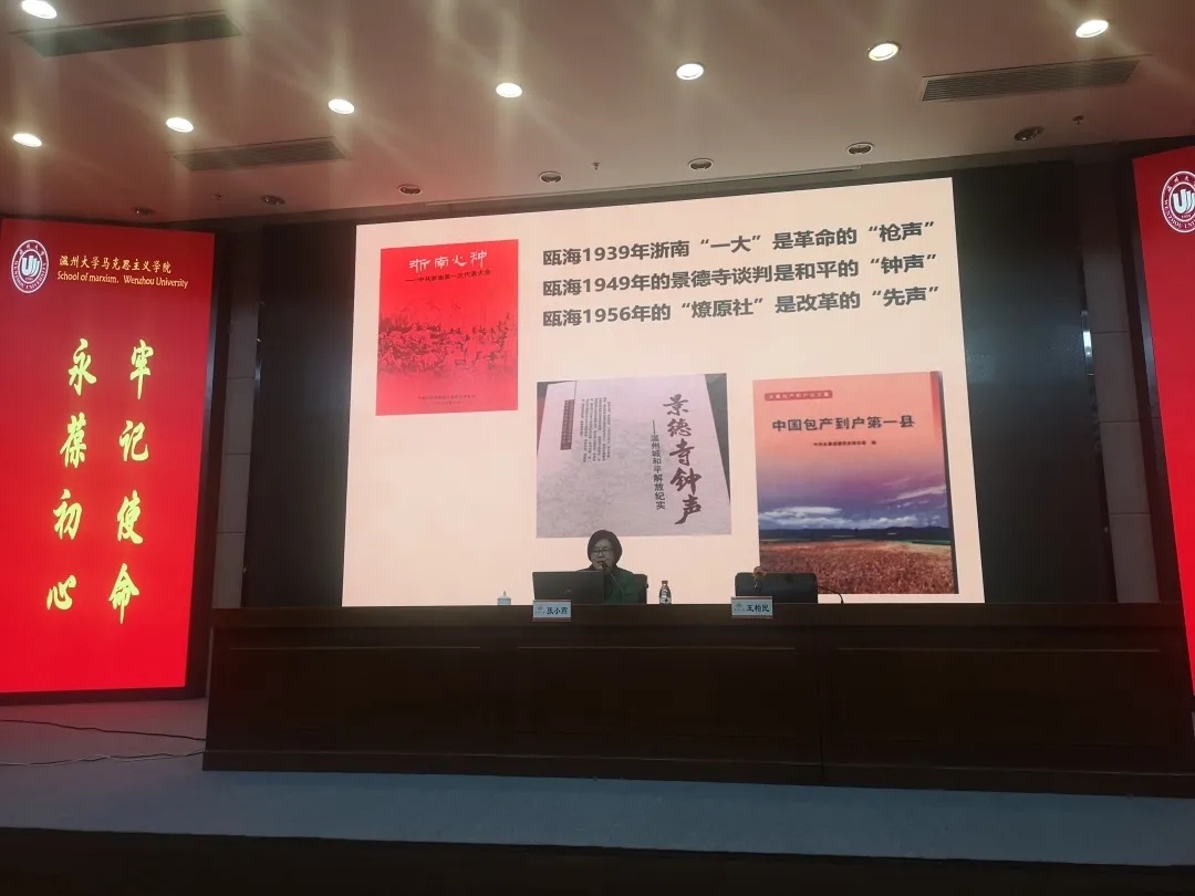 张小燕教授从“弘扬红船精神”的主题切入,以1919“五四运动”、1920“共产党宣言”、1924“温州独立支部”、1930“红十三军”、1935“浙南挺进师”、1939“中共浙江省一大”、1949“五星红旗”、1978“改革开放”为主线,向我们展示了为中国共产党波澜壮阔的奋斗史、改革史,并巧妙地融入了每一个重要历史事件中的温州人、温大人、马院人元素。通过张教授激情满满、如数家珍的盘点阐述,让在座师生全面了解“红色文明在瓯越”的深刻内涵。