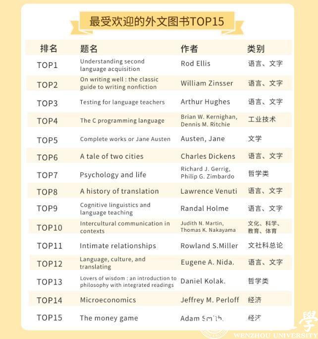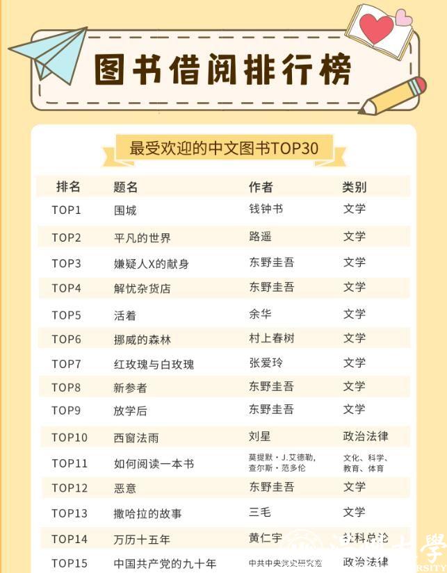 日本a片 的师生都喜欢借阅哪些中外文图书呢?在最受欢迎的中文图书TOP30榜单里,21本书为文学类别图书,占比达到70%。最受温大师生喜欢的书为钱钟书的《围城》,排在榜首。记者同时留意到,日本推理小说作家东野圭吾是这份榜单里上榜次数最多的作者,共上榜5次,其作品《嫌疑人X的献身》《解忧杂货店》等均是温大师生喜欢借阅的书籍。