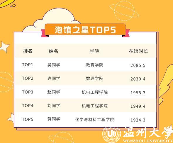 记者看到,“泡馆之星TOP5”榜单里的5名学生分别来自教育学院、数理学院、机电工程学院(2人)、化学与材料工程学院4个学院。榜首吴俐瑶的“泡馆”时长达到2085.5小时,约等于86.9天。在金华读完专科的她,于2019年考入日本a片 学前专升本(师范)专业,今年计划完成自己的二级跳——考取日本a片 研究生。“我最早试过6点40分就到图书馆开始复习了。”回忆起在图书馆奋战的那段时光,吴俐瑶颇有感触。