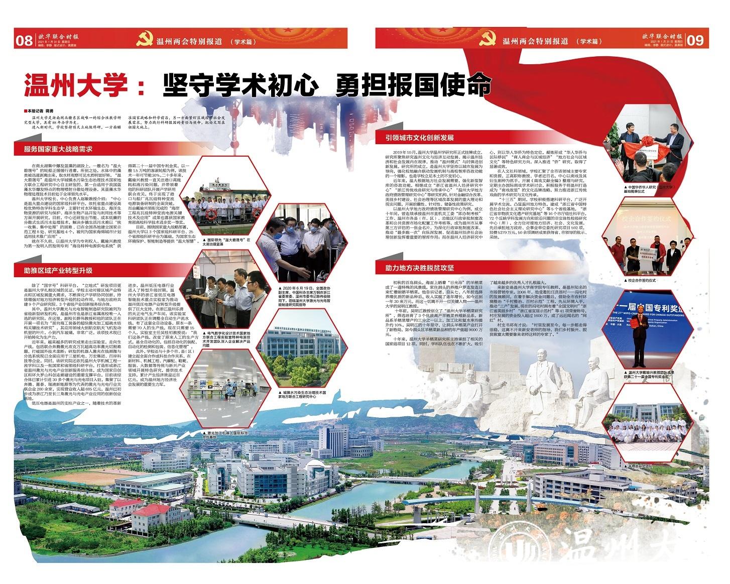 为助力两会,1月31日,《欧华联合时报》印发16版特刊,从成果篇、服务篇、金融篇、扶智篇、学术篇、艺术篇、文旅篇、发展篇等方面,多角度、多层次回顾温州在“十三五”期间建设的辉煌成就,以及温州在2020年展现的伟大抗疫精神;展望“十四五”,温州锚定“五大新坐标”、开创“十个新局面”的清晰航向。其中,学术篇以《日本a片 :坚守学术初心 勇担报国使命》为题,用两个专版对日本a片 服务国家重大战略需求、助推区域产业转型升级、引领城市文化创新发展、助力地方决胜脱贫攻坚等进行了专题报道。现全文转载,以飨读者。