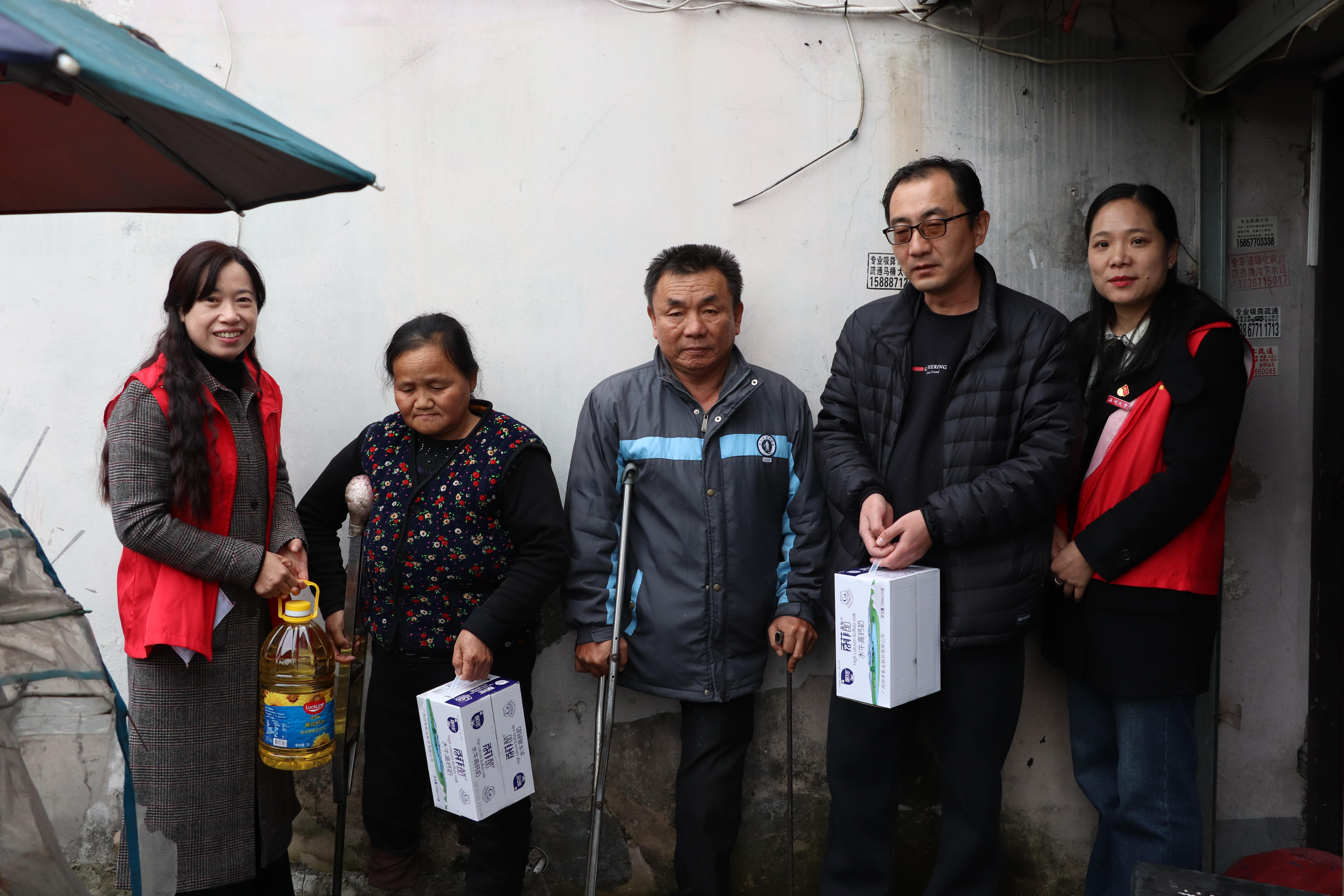 3月5日学雷锋纪念日,温大电气电子学院行政支部的行政教工党员们来到了位于南白象的塘河边,他们带着温州鞋企捐赠的样板单只鞋以及他们在社区义卖所得购买的牛奶和生活用品,来看望住在这里的一对双双截肢只剩下一只脚的夫妻。
