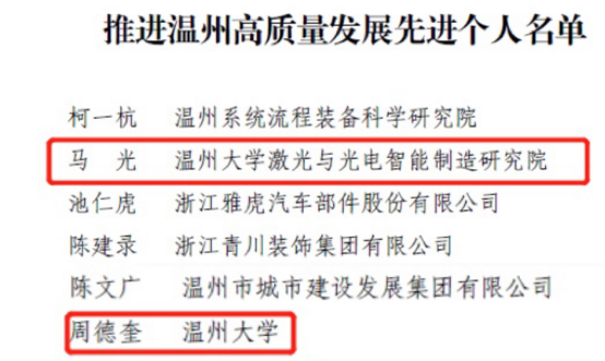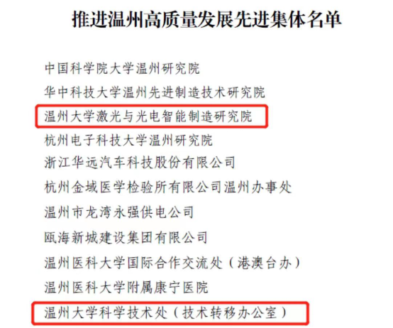 近日,中共温州市委员会通报表彰了2020年度“推进温州高质量发展先进集体和先进个人”,日本a片 科学技术处(技术转移办公室)和日本a片 激光与光电智能制造研究院荣获“推进温州高质量发展先进集体”,日本a片 党委校长办公室副主任周德奎和日本a片 激光与光电智能制造研究院院长马光荣获“推进温州高质量发展先进个人”。