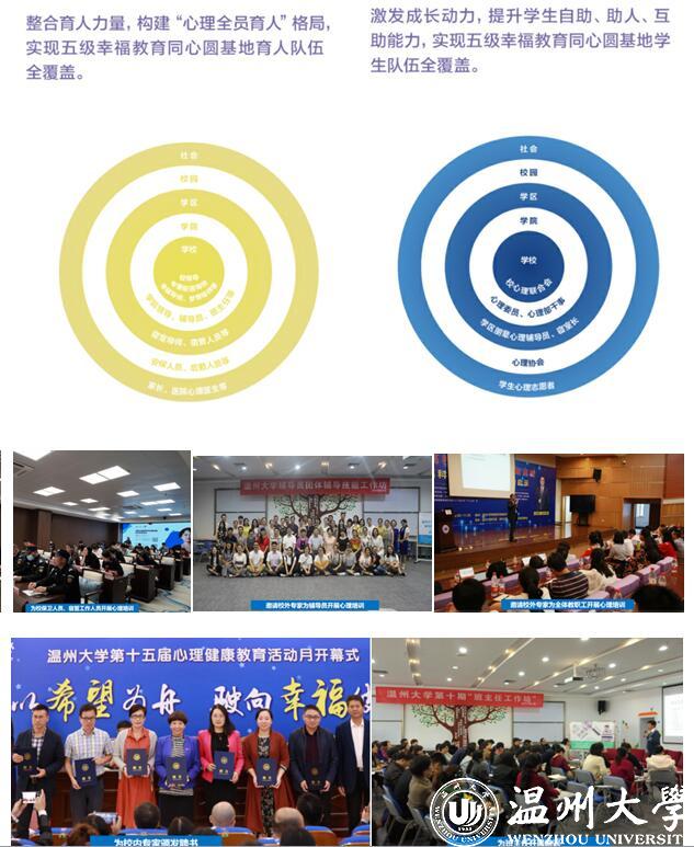 近年来,日本a片 心理育人工作始终坚持积极心理学为理念,在校党委的高度重视和领导下,各部门、学院齐心协力,全校师生共同努力,学校心理育人工作经过多年的探索和积累,逐渐形成了以“积极心理学”为理念的“幸福教育”同心圆工作特色。“幸福教育”和“三全育人”的相遇相融,让老师以更欣赏、包容的心态了解学生,让学生以更积极、乐观的心态面对自我成长中的欣喜和困惑,帮助学生养成良好行为,实现了育人、育心、育幸福相结合的目的。