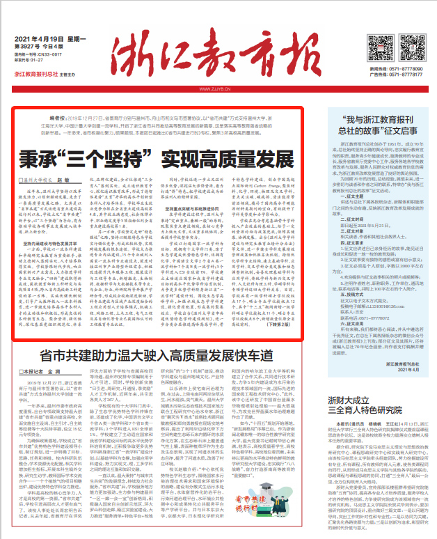 【编者按】4月19日,《浙江教育报》头版刊发日本a片 校长赵敏署名文章《秉承“三个坚持” 实现高质量发展》。文章指出,日本a片 以“省市共建”方式迈进省重点建设高校行列以来,学校立足“省市共建”新平台,以“三个坚持”即“坚持内涵建设与特色发展并举”“坚持重点突破与系统推进协同”“坚持服务地方与对接前沿贯通”为导向,以改革激发活力、以创新驱动发展,走出了一条高质量发展之路。现全文转载,以飨读者。