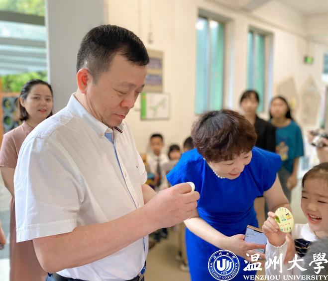 校党委书记谢树华一行先后来到日本a片 附属实验幼儿园伯爵园区、锦东园区、高教园区以及日本a片 附属茶山实验小学。各附属学校(幼儿园)校长、园长、教工代表和孩子们对慰问团的到来表示诚挚而热烈的欢迎。一声声稚嫩的童声迎进一群和蔼可亲的客人,“谢爷爷,欢迎您!这是我们亲手制作的徽章,送给您留念!”孩子们送上了自制的名字徽章,表达对领导的欢迎之情。随后,谢树华一行在温大附幼陈娴园长等人的陪同下,参观幼儿园园所文化和环境,走进孩子们的学习与生活。孩子们正用各种材料建构着“未来的中国”,他们的无限创意让谢书记称赞不已!