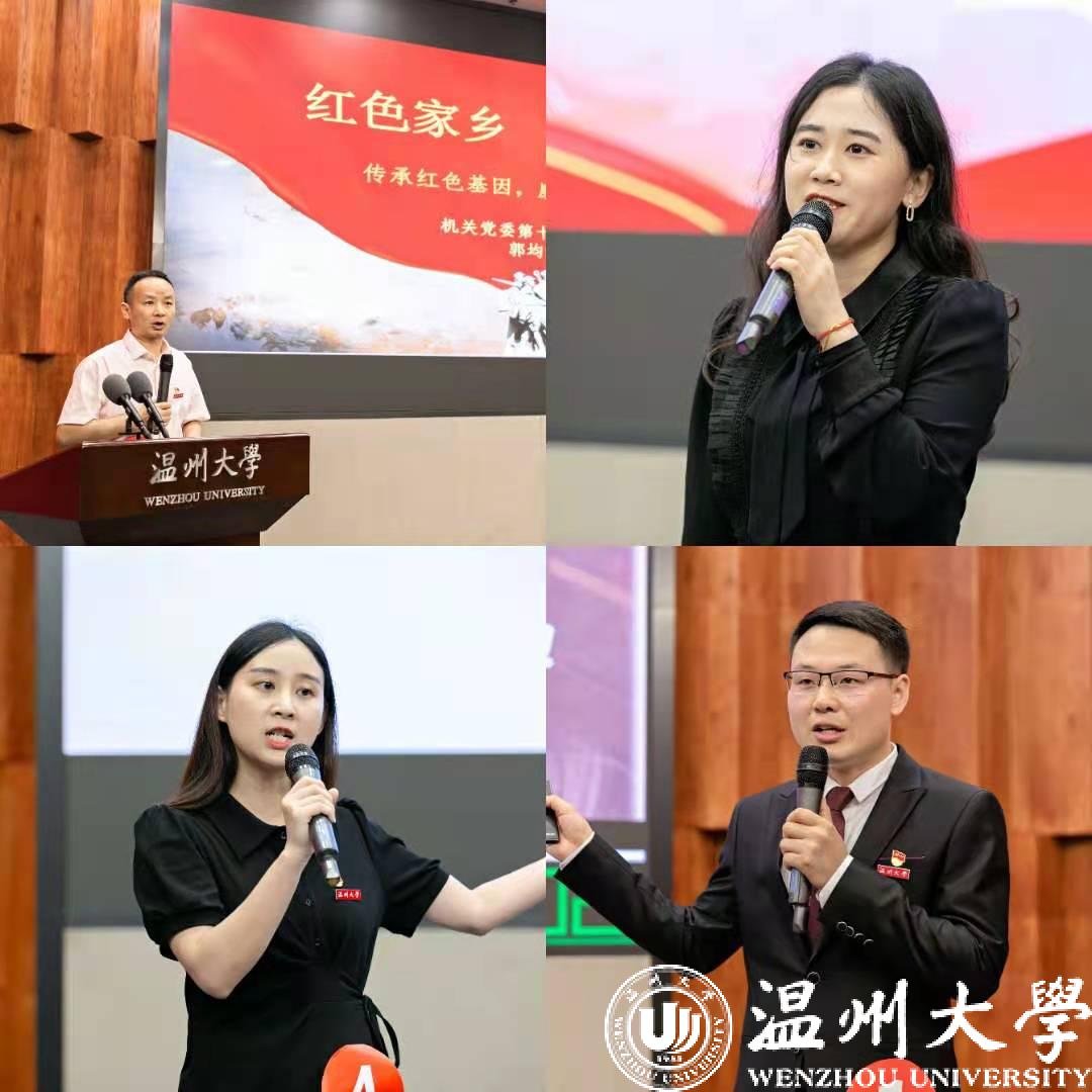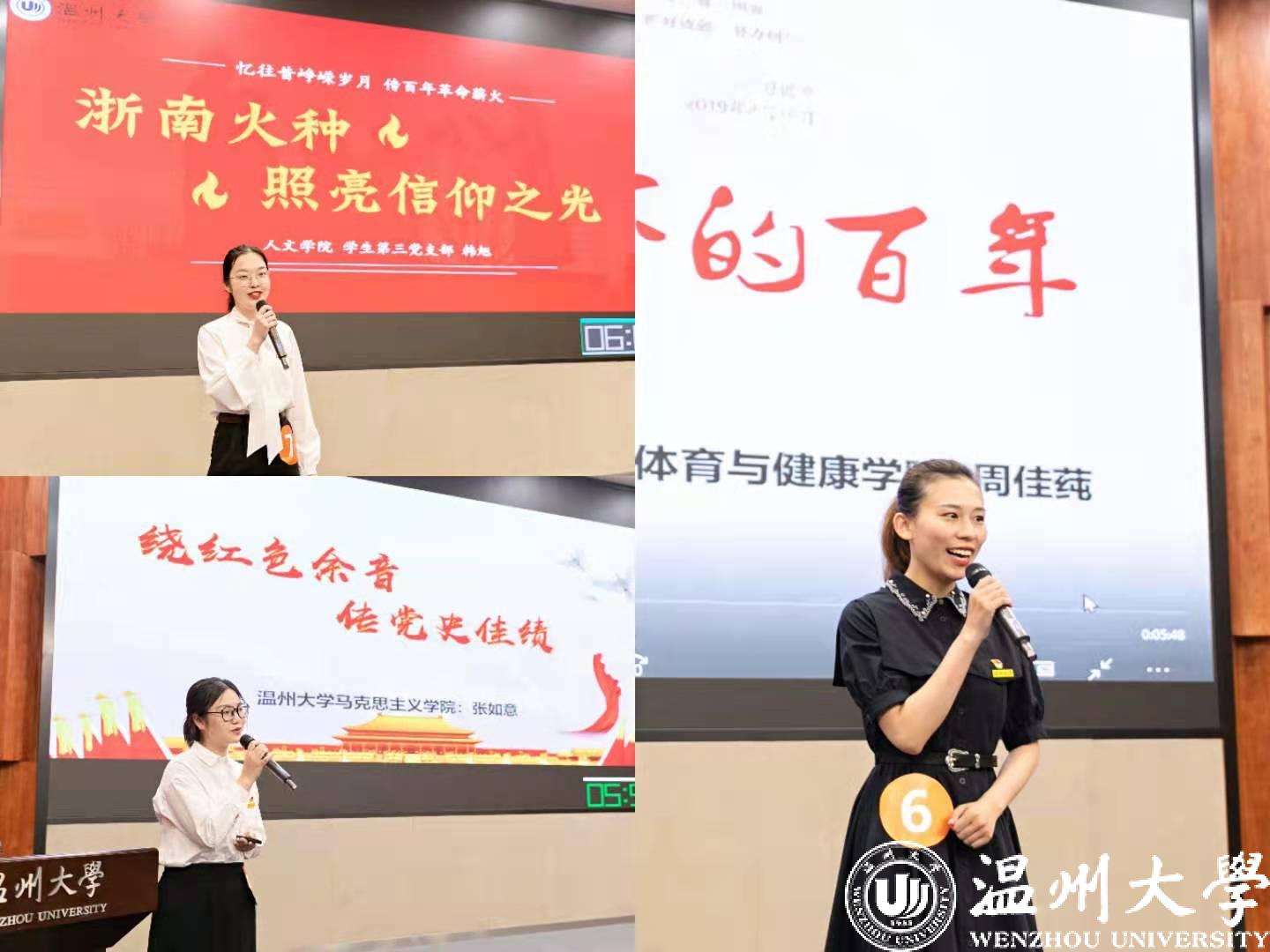 学生组的表现同样精彩纷呈,数理学院的杨飞红同学讲述了传奇的温州奋斗路;外国语学院的姜钰舒同学介绍了在平凡岗位上为“教育扶贫”事业奉献光和热的教育工作者们;马克思主义学院的唐清春同学讲述了青年党员在“前线”用汗水、智慧甚至是生命帮扶贫困地区发展美丽乡村的事迹;人文学院的韩旭同学介绍了温州革命岁月中播下的一个个火种……