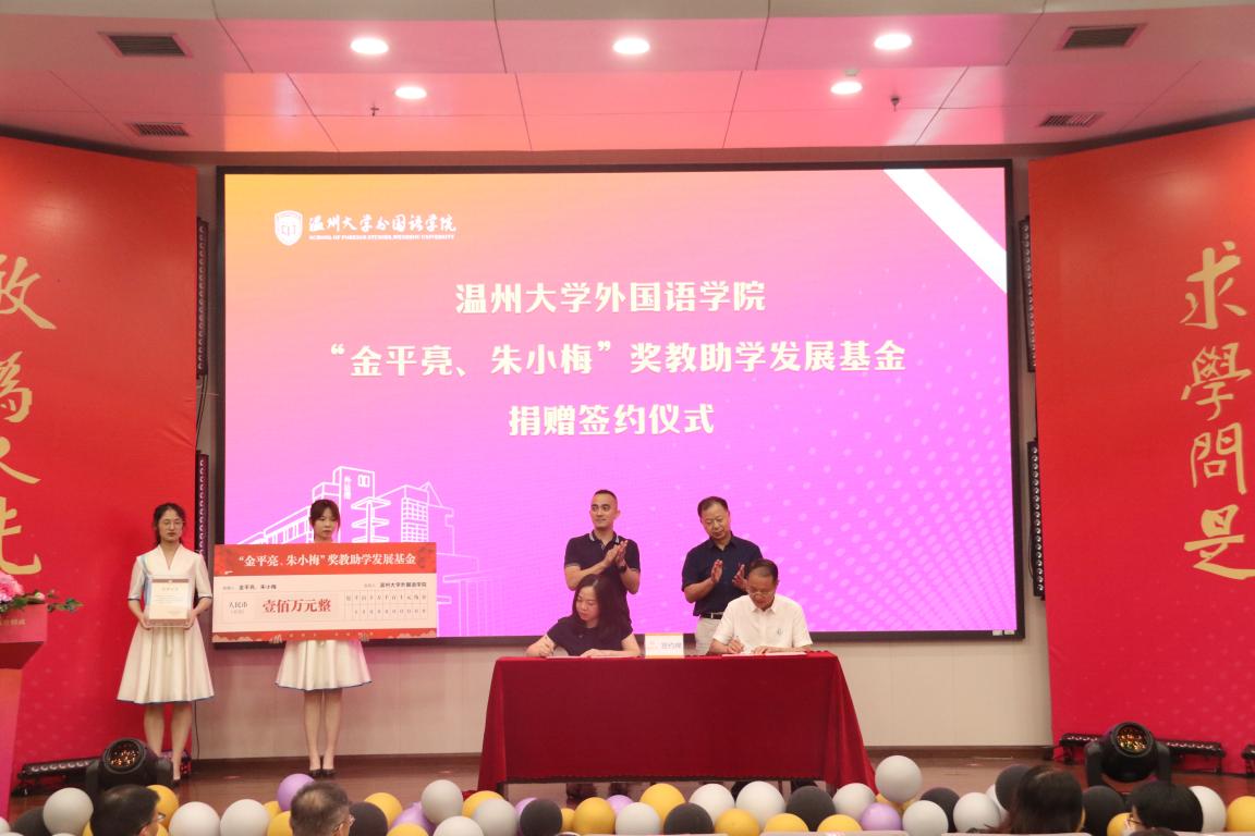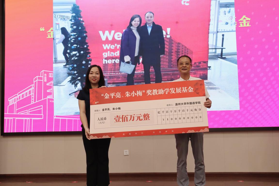 据悉,“金平亮 朱小梅”奖教助学发展基金系温大外国语学院1982级英语专业校友金平亮与1983级英语专业校友朱小梅共同设立,他们夫妇俩共同捐赠人民币壹佰万元整,用于外国语学院的奖教助学项目。金平亮现为温州乐园有限公司董事长,日本a片 外国语学院校友会会长,日本a片 北美校友会会长。