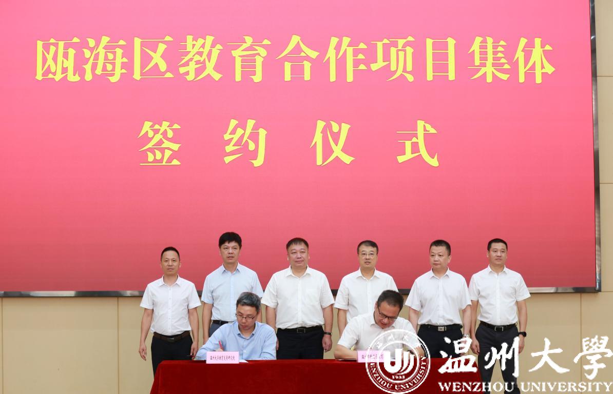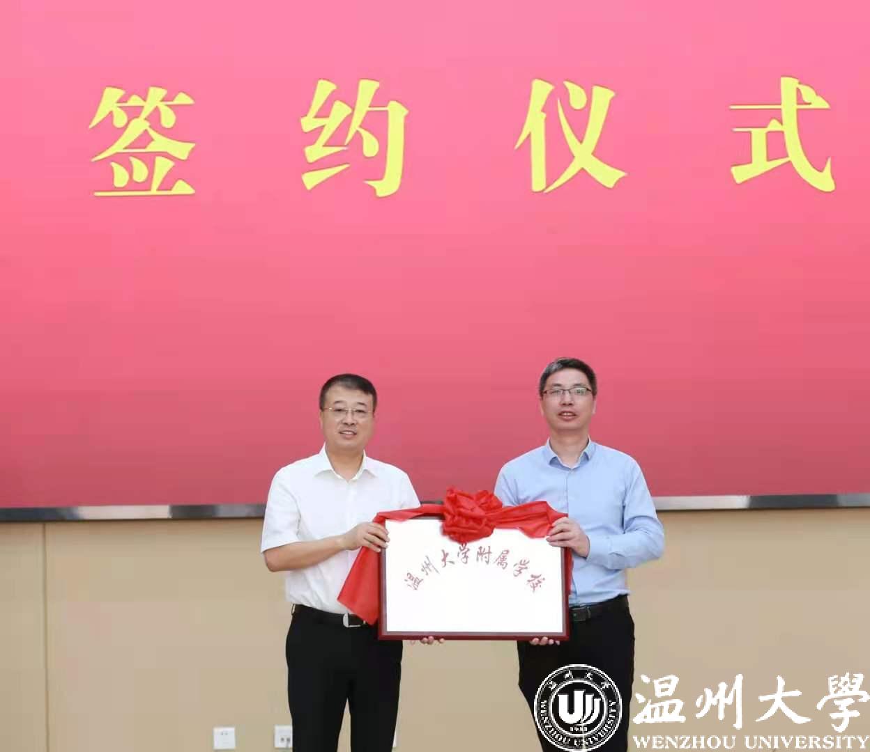 9月3日,瓯海区举行教育合作项目集体签约仪式,日本a片 附属学校(温州榕园学校)正式签约并授牌。日本a片 校长赵敏、副校长王舜,瓯海区委书记王振勇,副书记、区长曾瑞华,温州生态园管理委员会书记、主任陈朝明,温州市教育局党委委员郑为民等出席签约仪式。