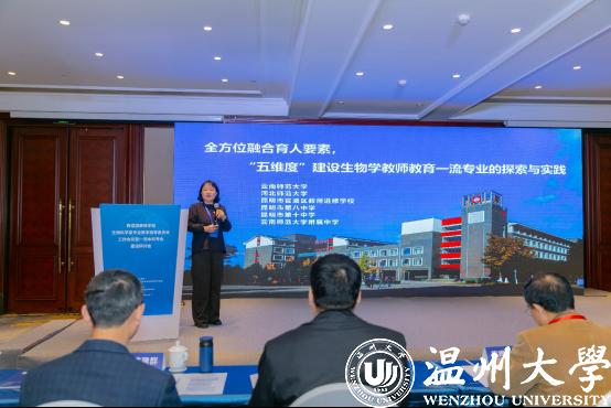 云南师范大学范丽仙作《全方位融合育人要素,“五维度”建设生物学教师教育一流专业的探索与实践》报告。通过传承教育同国家命运、民族前途紧密联系的联大精神,落实立德树人根本任务,全方位融合育人要素,创设并实践了“五维度”生物科学教师教育一流专业建设模式。