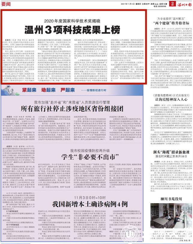 昨天,国家科学技术奖励大会在北京举行。在登上2020年度中国科技最高领奖台的奖项中,温州共有3项成果荣获国家科学技术奖。