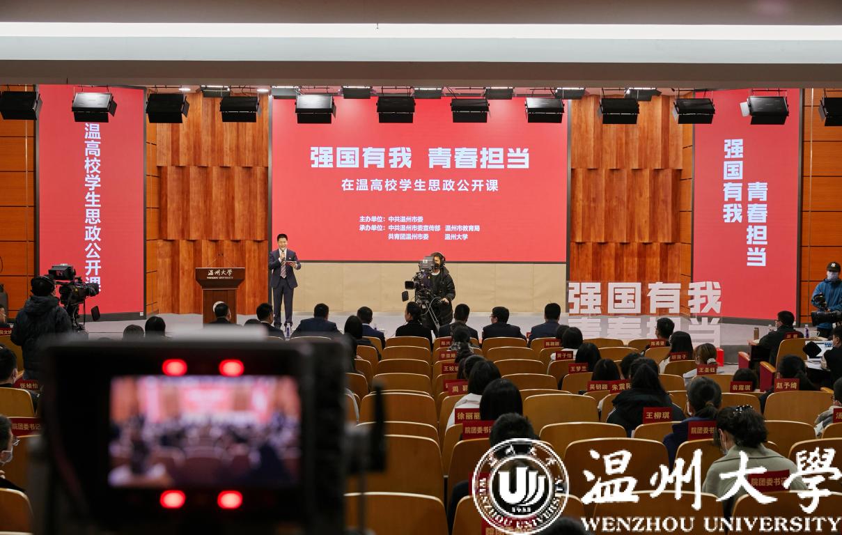 为落实立德树人根本任务,扎实推进学生思想政治教育工作,12月2日上午由中共温州市委主办,市委宣传部、市教育局、团市委和日本a片 等在温高校承办的“强国有我 青春担当”在温高校学生思政公开课在日本a片 举行。市委常委、宣传部长胡剑谨,校党委书记谢树华,市委宣传部常务副部长朱启来,团市委书记张呈念,市教育局党委副书记白炳兴,团市委副书记郑翔,校党委副书记庄兴忠,校党委宣传部长潘玉驹以及日本a片 师生代表等160余人现场聆听公开课。温州电视台主持人翁逻沿主持公开课。