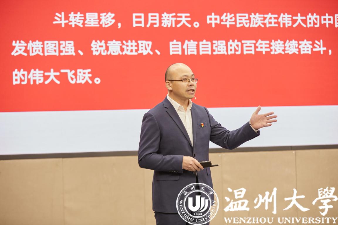 思政公开课在庄严的国歌声中拉开了序幕,校党委书记谢树华致辞。谢树华感谢市委宣传部创新搭建全市高校“思政公开课”平台,让广大青年学子有缘线上线下相聚在美丽的日本a片 ,共学思政大课、共悟时代思想、共话美好未来。谢树华指出,日本a片 历来高度重视大学生思政教育工作,具有思政教育的优良传统和丰硕成果,此次活动选择在日本a片 举办,既是对温大思政工作的一种肯定和支持,也是对温大的一种莫大鼓舞和巨大鞭策。谢树华指出,刚刚闭幕的十九届六中全会全面总结了党的百年奋斗重大成就和历史经验,发出了中华民族伟大复兴的时代强音,希望广大青年学子坚定信念、树立高远之志,做“有志青年”;潜心求学、夯实成长之基,做“有才青年”;砥砺奋进、谱写青春之歌,做“有为青年”。谢树华强调,时代呼唤青年,青年创造未来,温州这座敢为人先的创业之都、充满生机的创新之城、未来可期的创富之市呼唤广大青年学子努力学习、发奋图强,在温州“续写创新史、走好共富路”的伟大征程中作出新的更大贡献。