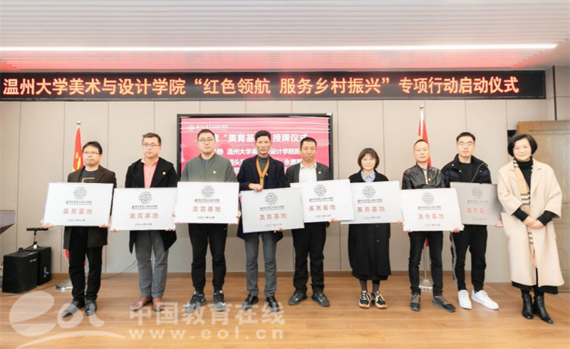 来自文成周山、瓯海丽岙、洞头霓屿、苍南马站、永嘉鹤盛、泰顺雅阳、平阳湖屿、苍南赤溪等8个县市区乡镇的有关负责人出席专项行动启动仪式,温大美院院长谢子静为其颁发“美育基地”牌子,开启校地党建共建的友好之旅,也为温大美院深入开展社会美育开辟了重要途径。