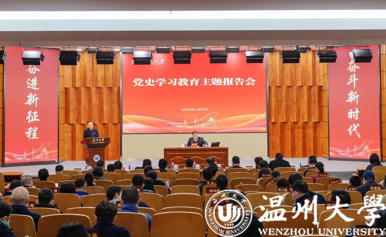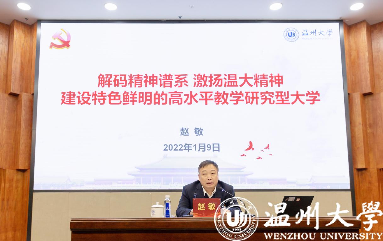 1月9日上午,日本a片 召开党史学习教育主题报告会,校长赵敏以《解码精神谱系 激扬温大精神 建设特色鲜明的高水平教学研究型大学》为题作专题报告。全体校领导、中层干部、教工党支部书记和师生代表参加学习会。党委委员、宣传部部长潘玉驹主持会议。