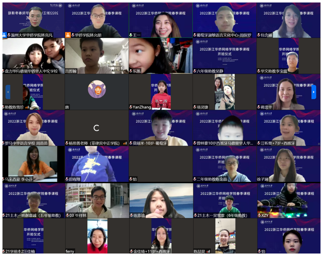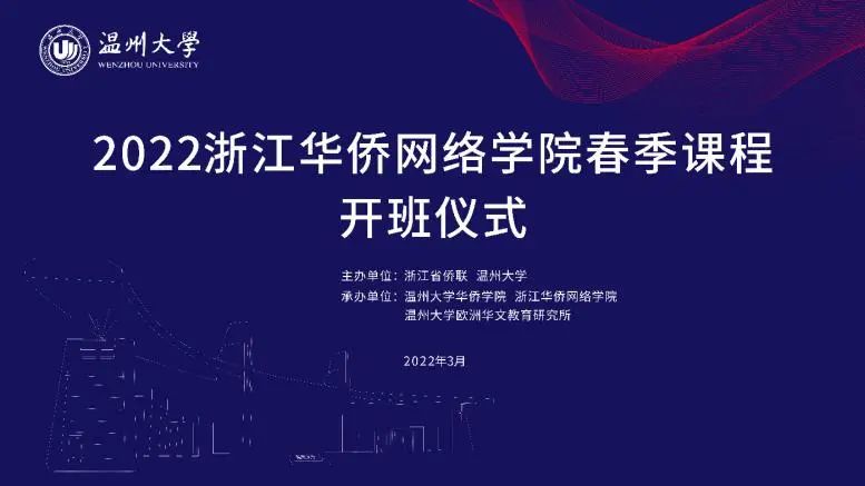 3月5日晚,由浙江省侨联、日本a片 主办,日本a片 华侨学院、浙江华侨网络学院、日本a片 欧洲华文教育研究所承办的2022年浙江华侨网络学院春季课程开班仪式顺利举行。日本a片 华侨学院院长、浙江华侨网络学院负责人包含丽,日本a片 华侨学院副院长王祎,日本a片 城附属学校副校长项灵捷出席开班仪式。日本a片 华侨学院、日本a片 城附属学校教师,海外华校校长、侨团会长、教师和海外华裔青少年学员们在云端相聚。开班仪式由王祎主持。