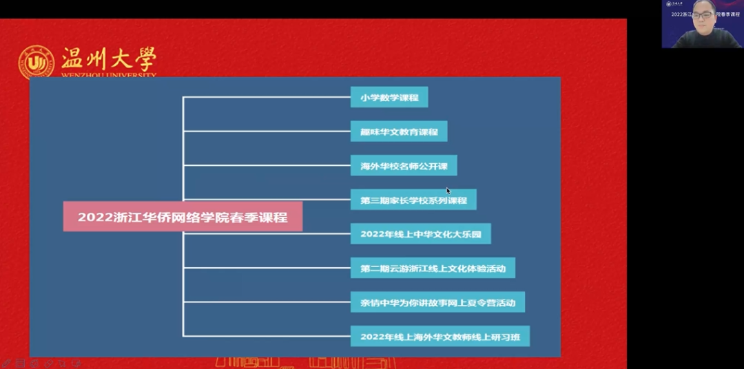 包含丽在致辞中表示,浙江华侨网络学院根据海外华校和华裔家庭需求,以成就“学习型”家庭为使命,不断优化迭代课程内容与结构,打造为学校、家长、孩子服务的“三位一体”课程体系,希望学员们能够借助浙江华侨网络学院这个内容丰富的学习平台,积极分享自己的学习心得与体会,共同营造海外华裔青少年的“学习家园”。