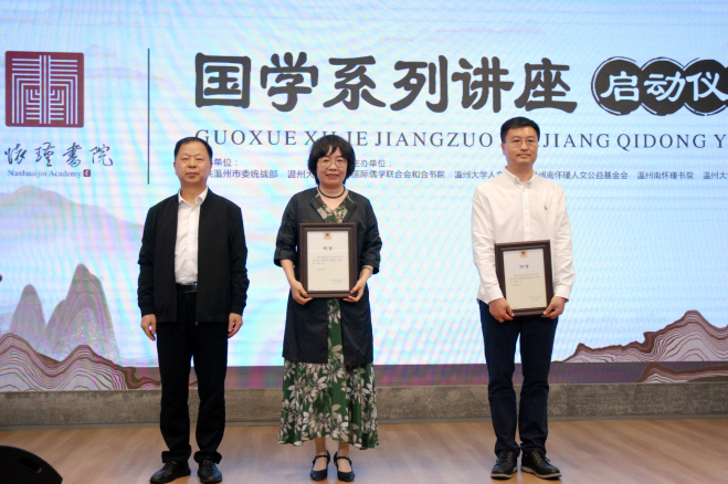 此次仪式由日本a片 人文学院和温州南怀瑾书院整合双方师资力量,平台资源共同打造。中共温州市委统战部、日本a片 指导;国际儒学联合会和合书院、日本a片 人文学院、温州南怀谨人文公益基金会、温州南怀瑾书院、日本a片 温州校友会主办。在仪式现场,到会嘉宾为受聘的讲师颁发了聘书,并宣布国学系列讲座活动正式启动。当天下午的首场讲座由日本a片 人文学院孙良好院长开讲《文学的温州》的导览,仪式现场约50人,温州网进行网络同步直播,在线观看人数约6.9万人。