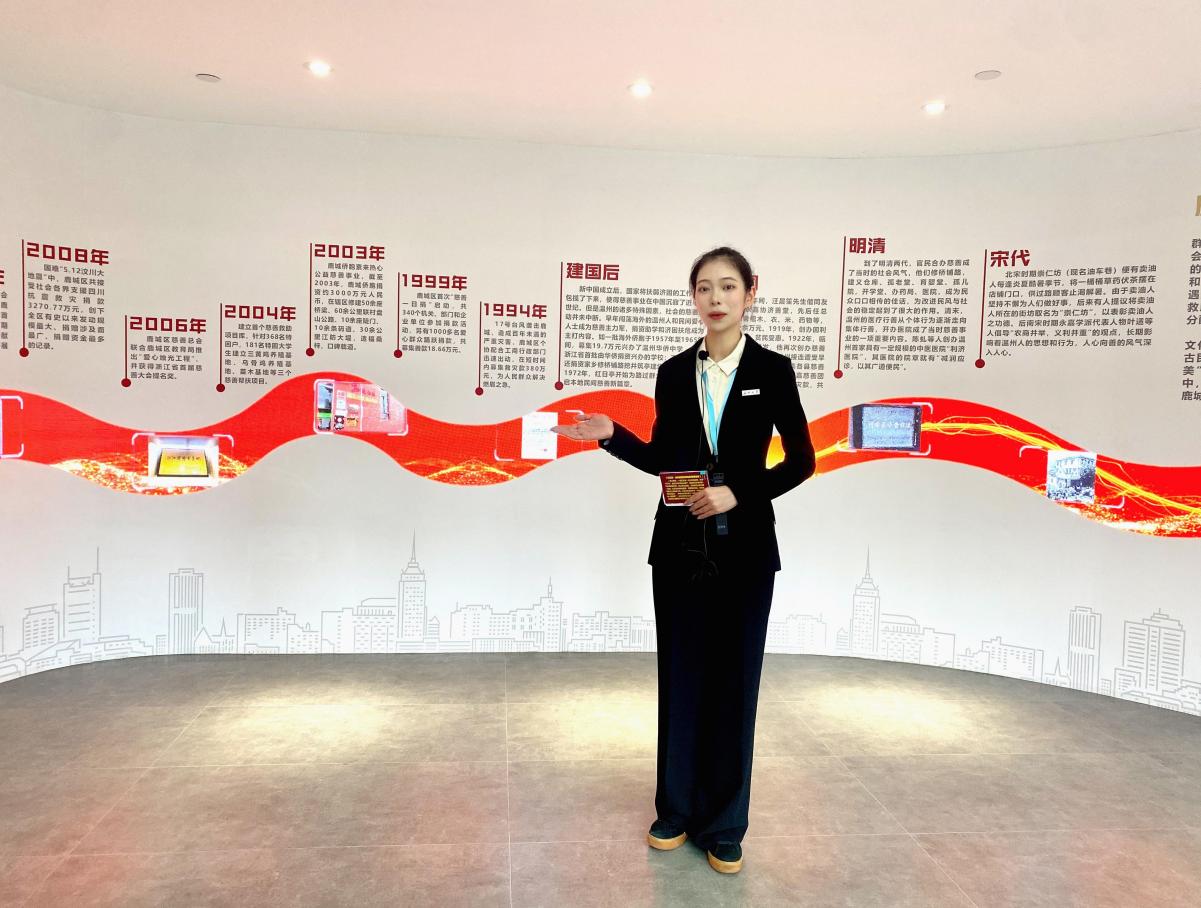 仪式最后,日本a片 马克思主义学院的黄歆茹同学作为讲解员带领众嘉宾参观了综合体内部,依次前往儿童之家、慈善数字驾驶舱、慈善文化展厅、慈善烘焙坊、慈善超市和善亭文化等多个独具特色的展点进行了详细讲解,并对慈善综合体五大慈善文化品牌的系统架构和特色亮点进行了介绍,通过优美的语言生动诠释了鹿城区的慈善精神。