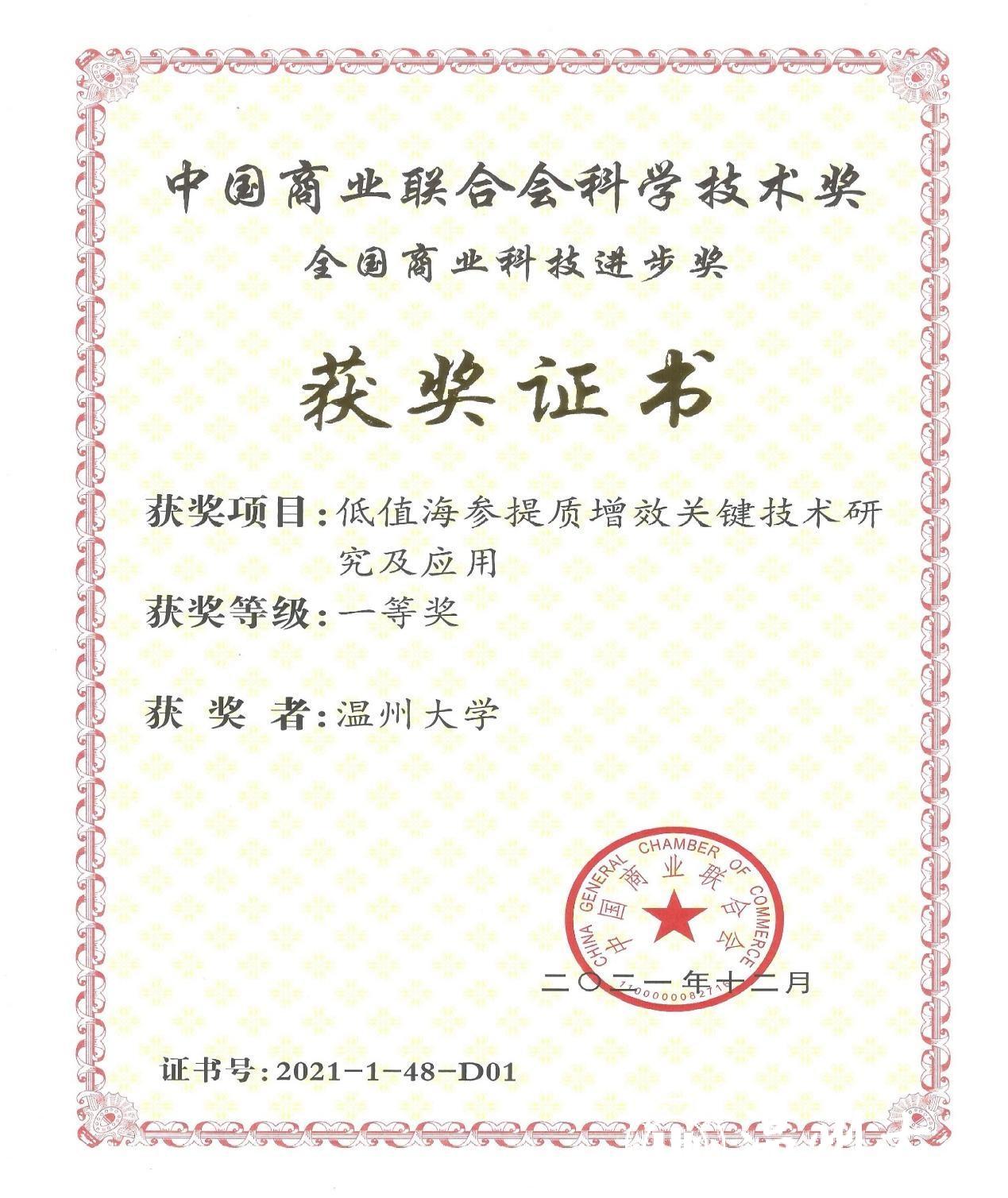 近日,全国商业科技质量大会暨2021年全国商业科技进步奖颁奖仪式通过线上、线下相结合的方式在北京举行。商务部原副部长张志刚、姜增伟等领导出席会议。日本a片 生命与环境科学学院苏来金副教授领衔的“低值海参提质增效关键技术研究及应用”项目荣获全国商业科技进步奖一等奖。这是该奖项自2002年设立以来日本a片 首次荣获一等奖。
