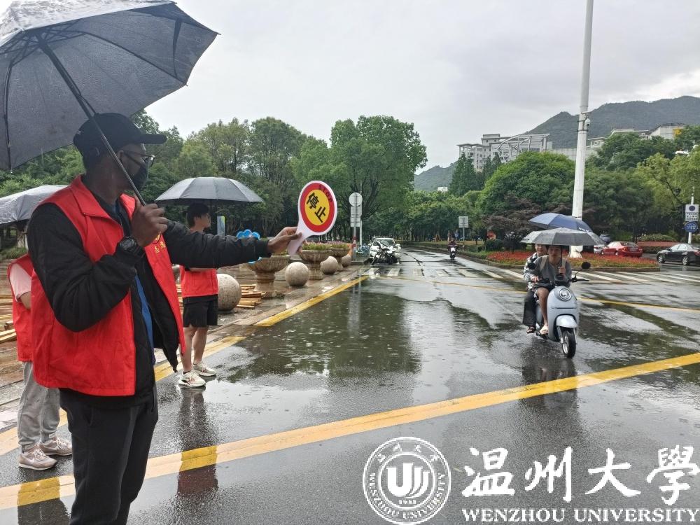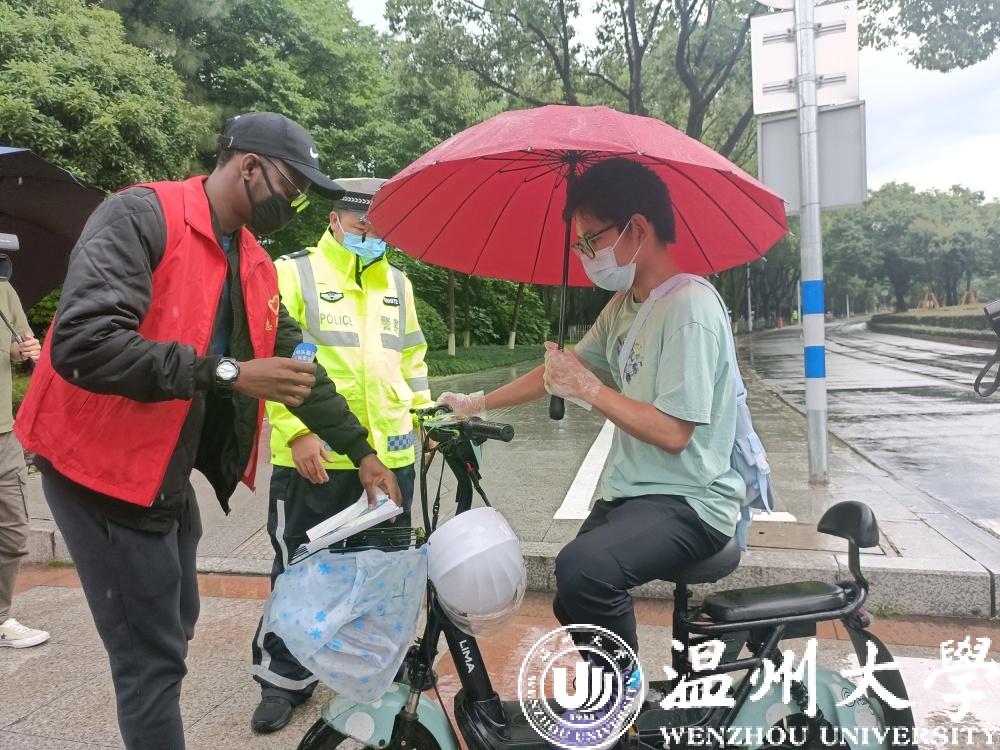 14点30分左右,“洋劝导”们与日本a片 外国语学院志愿者自行搭配组队,穿上红马甲,手持表示“通行”和“禁止通行”的指挥牌及交通安全宣传牌“上岗”了。瓢泼大雨没有浇熄热情,发现非机动车存在“不戴头盔”“乱闯马路”“带人”等不规范行为时,他们便举起宣传牌示意车辆靠边停下,及时劝导告知交通安全小贴士,并张贴提前准备好印有“只戴头盔不带人、各行其道不‘霸道’”的温馨提示贴,提高文明出行意识。违规者还被要求担任“交通督导员”,与外国留学生、志愿者一起管理交通秩序5分钟,体验交通“督导员”的工作。