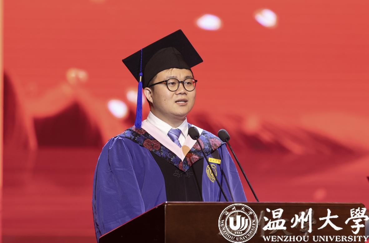 研究生代表、马克思主义学院的张剑宇同学分享了自己研究生期间“为农而作、为民发声”的科研报国理想与实践,并表达了对母校的感激之情:“接过‘求学问是,敢为人先’的火炬,背起‘光大国族,造福人群’的行囊,我们将走向城镇乡野、奔赴五湖四海。谢谢您,我的温大!”