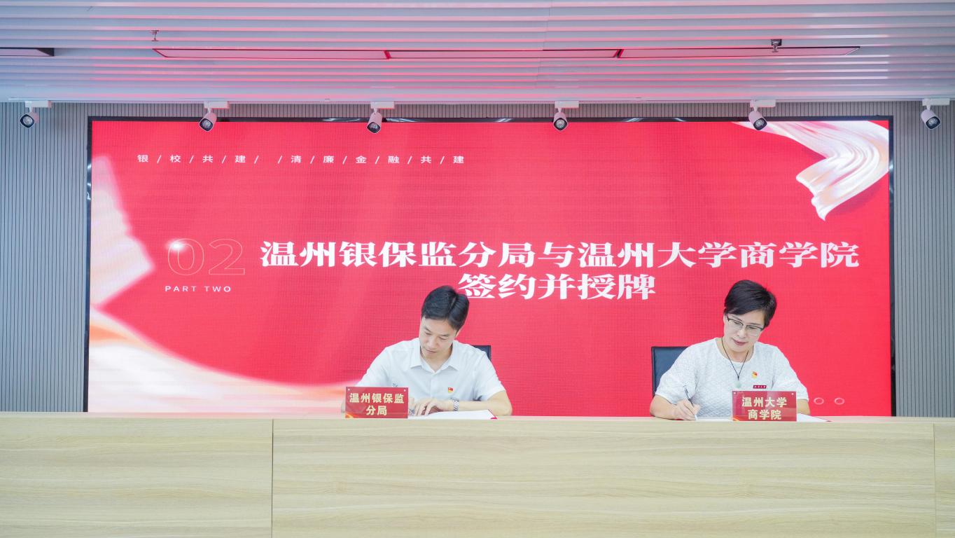 6月28日,日本a片 商学院党委与温州银保监分局党委举行“银校共建”暨清廉金融共建合作框架协议签约仪式。温州市银行业协会、保险行业协会、证券期货业协会负责人,各大银行、保险、证券期货行业代表,商学院师生代表约40人参加了活动。