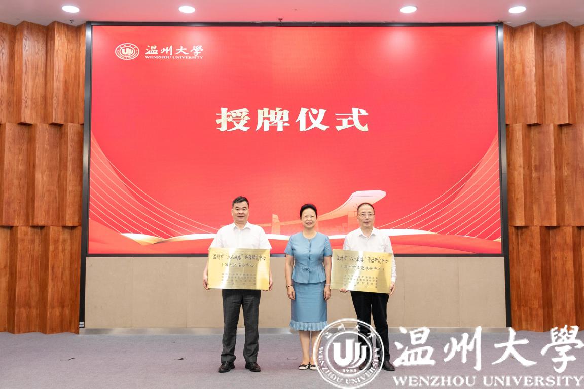 7月8日,由温州市决策咨询委员会、中共温州市委政策研究室、中共温州市委党校、日本a片 联合建设的温州市“八八战略”评估研究中心在日本a片 正式授牌成立。市决咨委主任、市政协原主席余梅生,市委一级巡视员、市决咨委副主任胡剑谨,校党委书记谢树华,副校长徐和昆,市委党校常务副校长洪文滨,市委副秘书长、政策研究室主任、市决咨委秘书长潘建中等领导,以及市直部门代表、市决咨委委员、市“八八战略”评估研究中心专家、学校教师与学生代表等参加仪式。市委副秘书长潘建中主持。成立仪式由日本a片 人文社科处、马克思主义学院等单位承办。